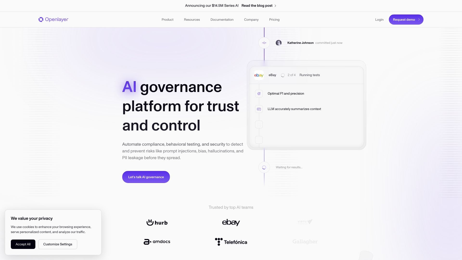 当社のプラットフォームは、モデルの在庫管理、リスク分類、およびコンプライアンスワークフローを自動化し、100以上の行動テストを適用して、幻覚、バイアス、PII漏洩、毒性などの問題を検出します。