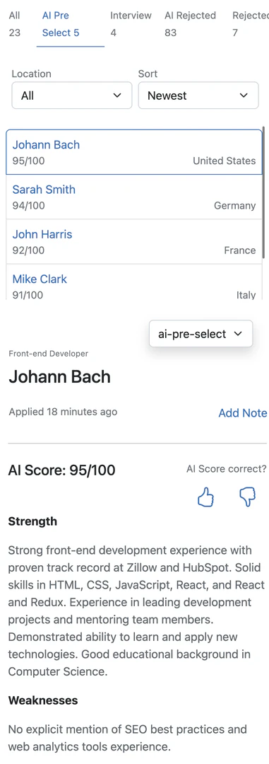 Applicant AIは、応募者が重要な質問に回答するカスタムフォームを通じて事前スクリーニングを行います。各応募者は回答に基づいてスコアが付けられ、高得点を取得した応募者のみがATSにリダイレクトされます。