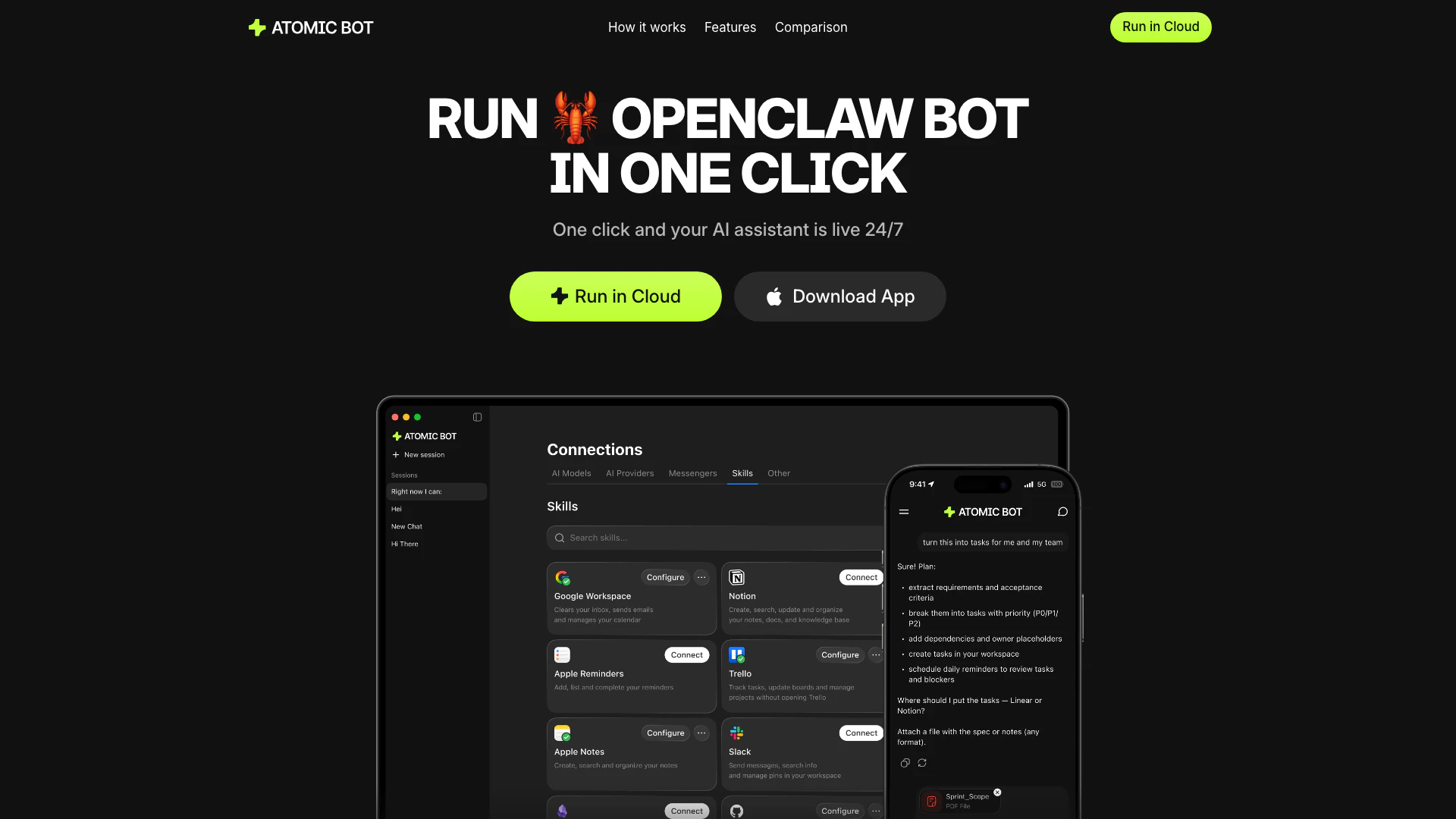 - 簡単なインストール: Atomic Botはワンクリックインストールを可能にし、非技術的なユーザーが簡単にセットアップしてアシスタントを迅速に使用できるようにします。
