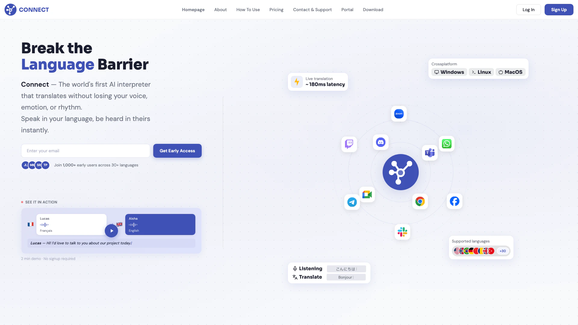 - リアルタイム翻訳: Connectは、ZoomやGoogle Meetなどのさまざまなプラットフォームで、180ms未満の遅延でリアルタイムに音声を翻訳し、シームレスなコミュニケーションを保証します。