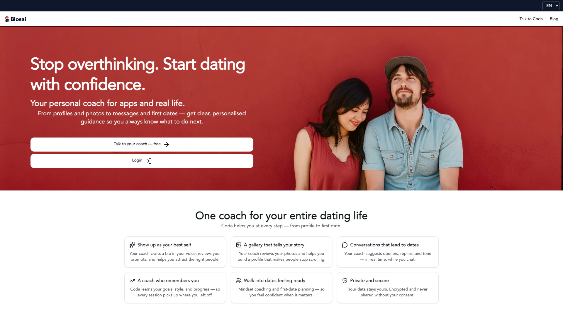 - パーソナライズされたコーチング: Biosaiは、プロフィールから初デートまで、デートのあらゆる側面に対してカスタマイズされたコーチングを提供し、ユーザーが独自の状況に合ったガイダンスを受けられるようにします。
