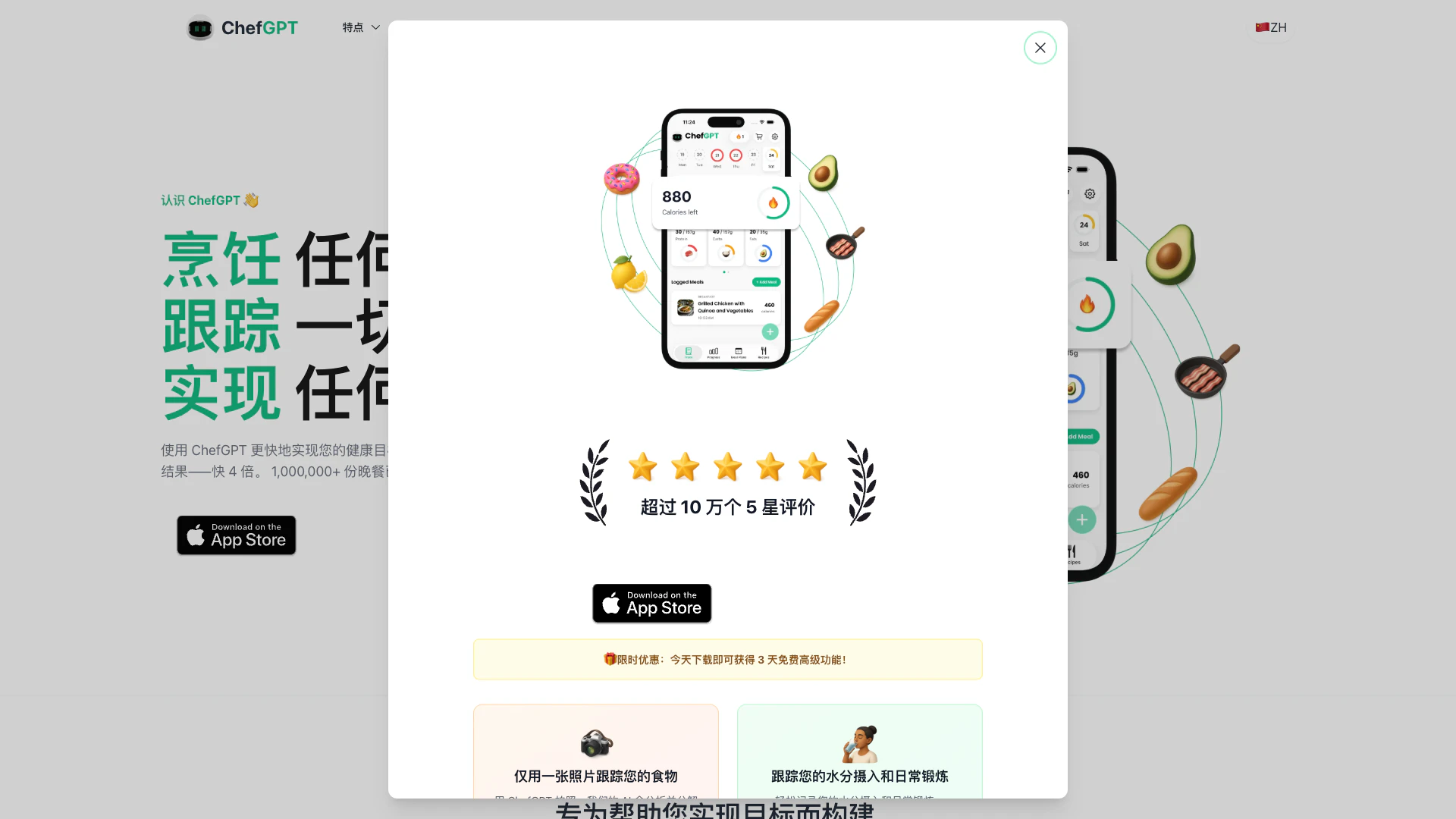 - 簡単なカロリー追跡: 食事の簡単な写真を撮るだけで、ChefGPTが材料を検出し、栄養情報を自動的に記録して時間を節約します。