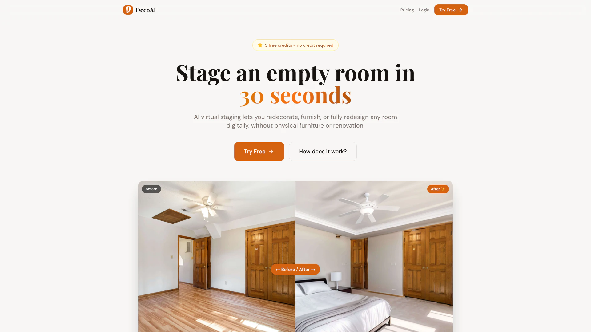 DecoAIのAIパワーによるバーチャルステージングで、空の部屋をたった30秒で美しく演出された写真に変身させましょう。