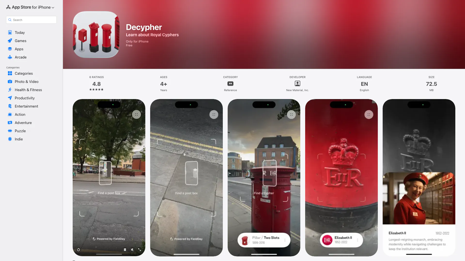Decypherは、カメラとAIを使用して、イギリスの郵便ポストや街の家具の歴史やデザインについて学ぶことができるアプリケーションです。郵便ポストの形状や「ロイヤルサイファー」が持つ意味を明らかにし、ユーザーが地域のコミュニティをより深く理解できるようにします。