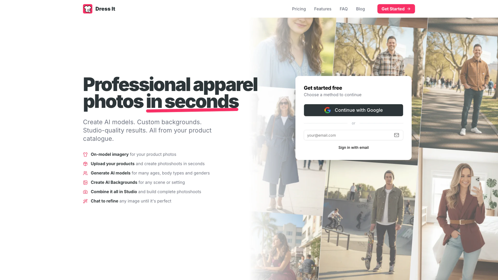Dress Itは、ブランドのためにプロフェッショナルなアパレル写真を簡単に作成するために設計された革新的なAI駆動ツールです。Dress Itを使用すると、ユーザーはAIモデルやシーンを生成でき、わずか数秒で完全なフォトシュートを実現します。このツールは、モデルや写真家を雇うなど、従来の写真撮影に伴うコストをかけずに視覚コンテンツを強化したいファッションビジネスに特に価値があります。高度なAI技術を活用することで、Dress Itはユーザーが製品をリアルで魅力的な方法で展示する高品質の画像を生成できるようにします。