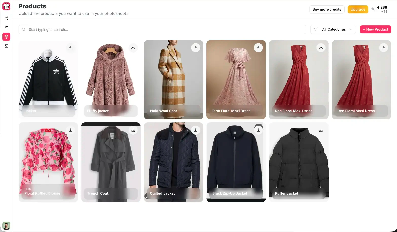 - 製品をアップロード: フラットレイ写真、マネキンショット、または既存の製品画像を使用してファッションアイテムを追加します。AIは自動的に生地の質感と衣服の構造を分析します。