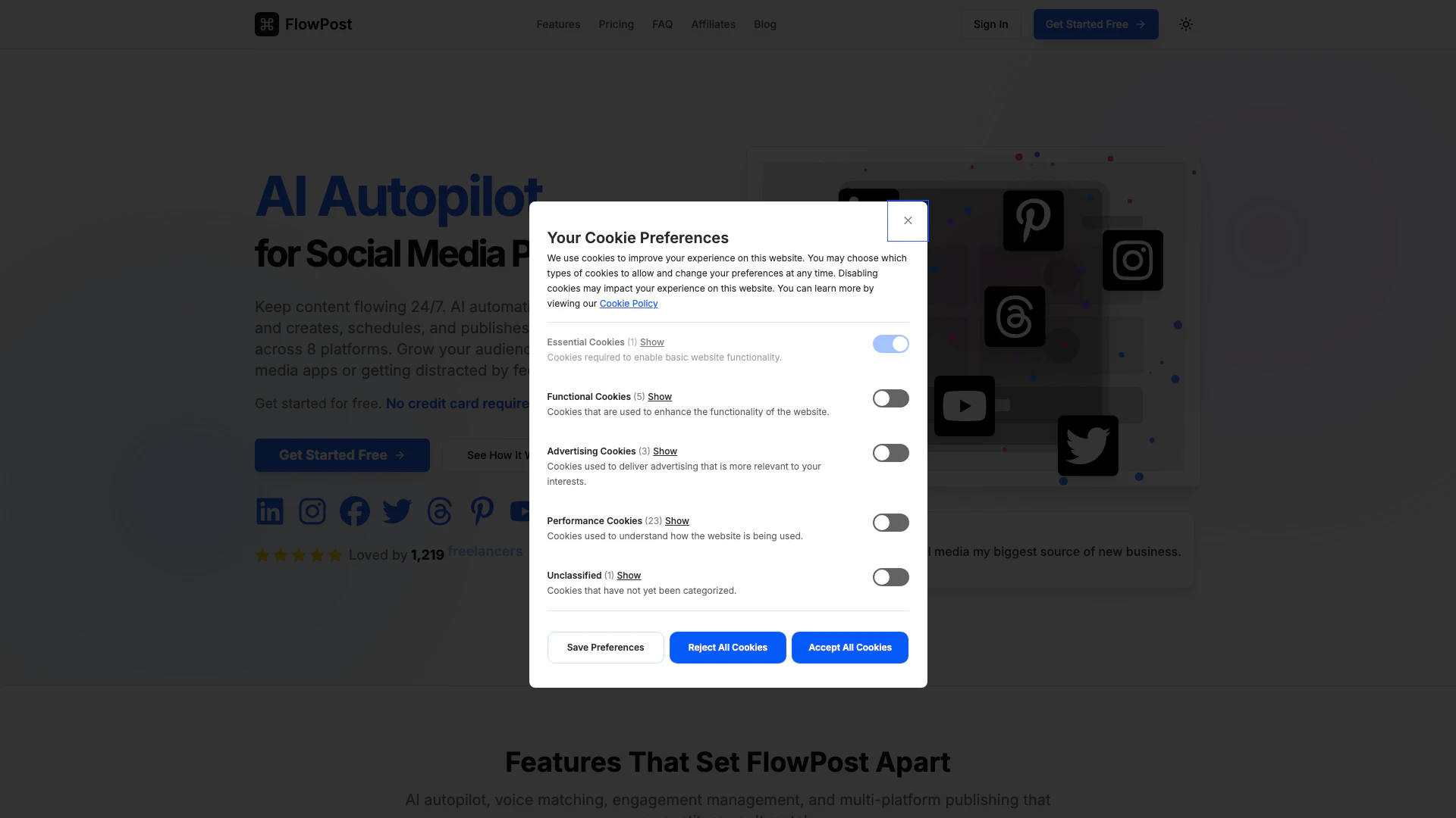 FlowPostは、ユーザーが独自の声に合わせてコンテンツを作成、スケジュール、公開できるAI駆動のソーシャルメディア管理ツールです。