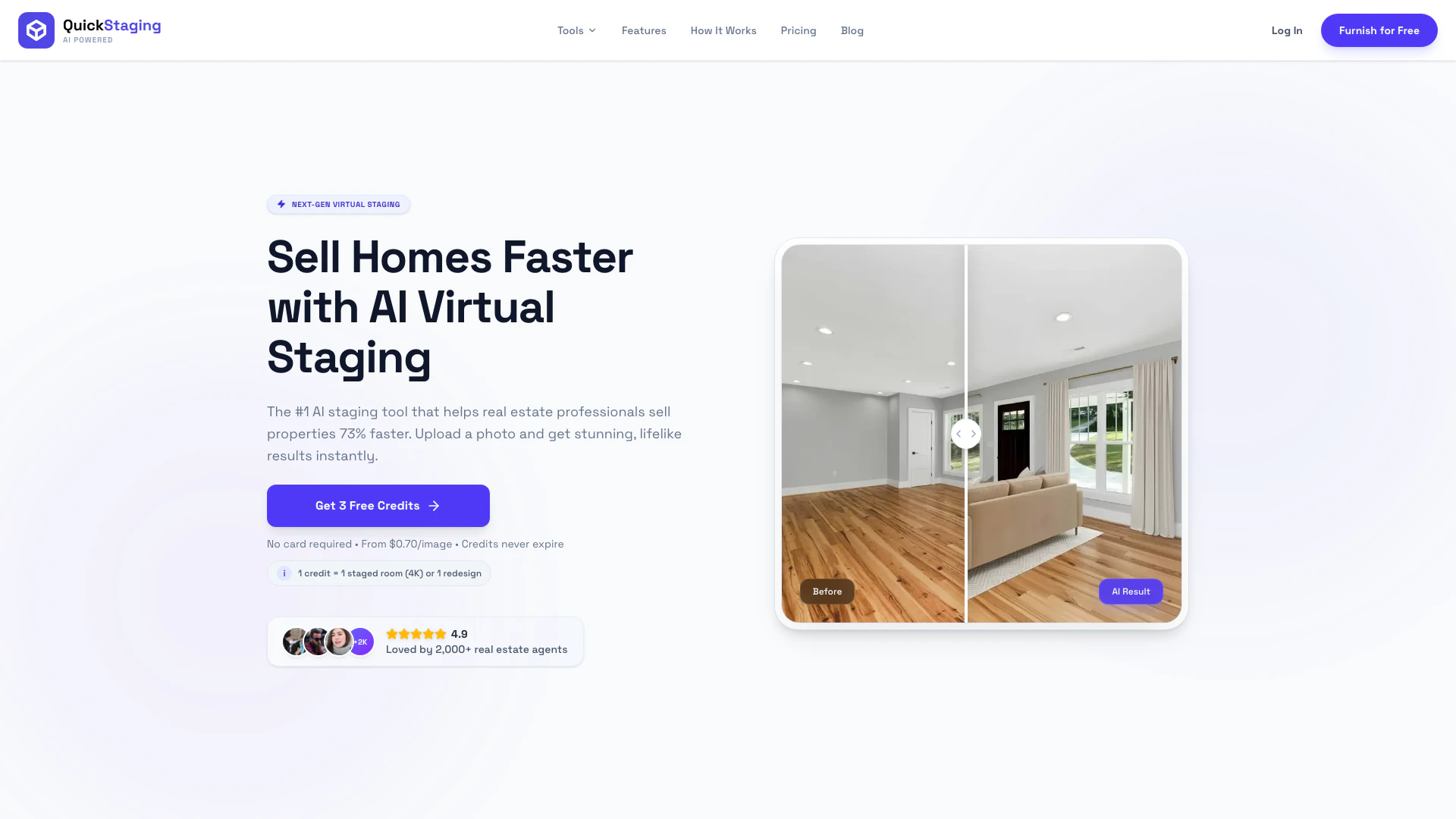 - コスト効果の高いソリューション: クイックステージングは、画像あたり0.72ドルからのクレジットを提供し、物理的なステージングに比べてはるかに安価な代替手段を提供し、最大90%の節約が可能です。