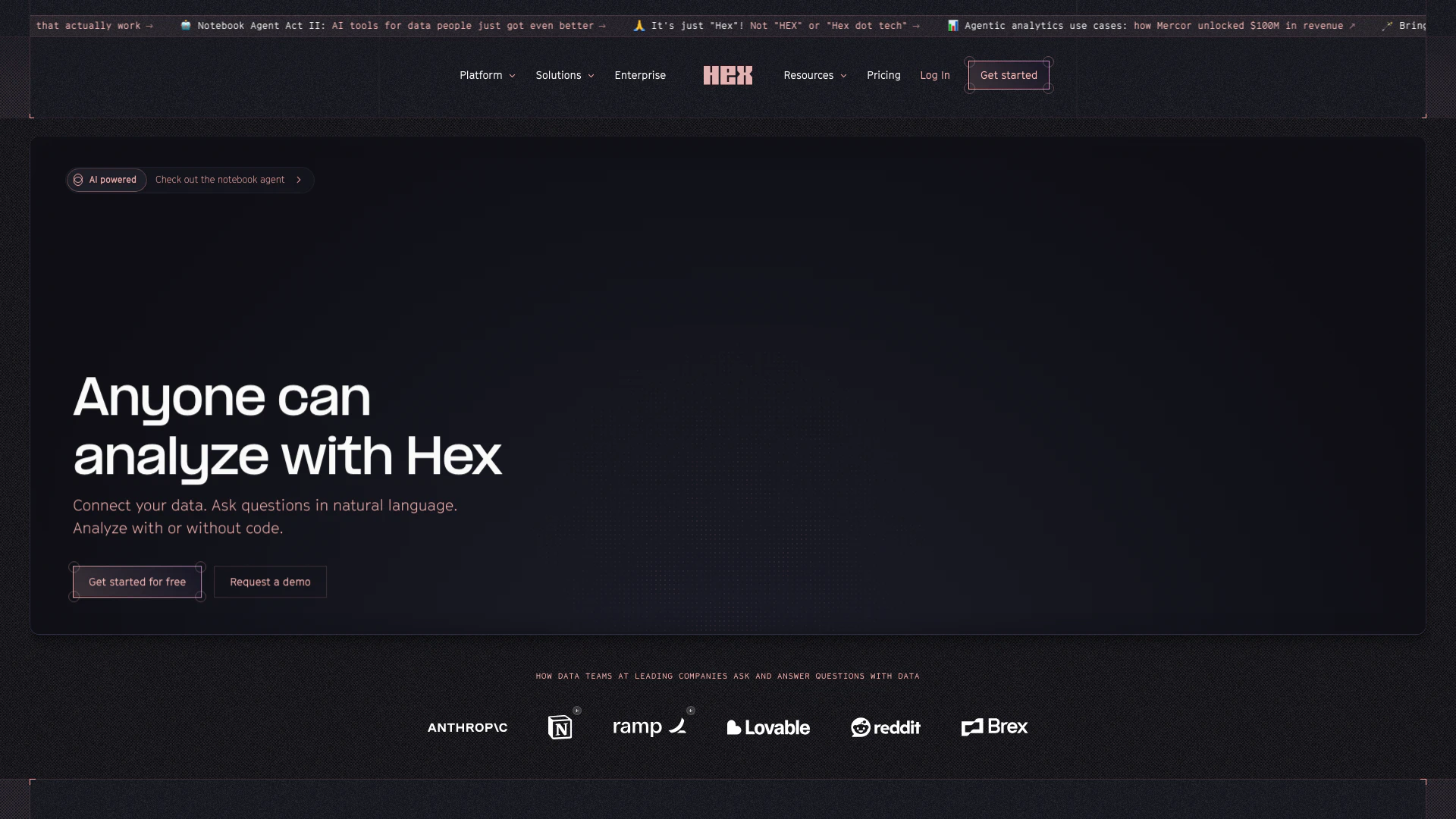 Hexは、データチームのデータワークフローを効率化するために設計された高度なAI駆動の分析プラットフォームです。強力なAI機能を統合することで、Hexはユーザーが洞察を実行可能なビジネスインパクトに変換することに集中できるようにします。このプラットフォームは、エージェンティック分析を強調し、ユーザーがデータとより直感的に対話できるようにし、自然言語処理と高度なデータガバナンスを活用します。これにより、Hexは単なるデータ分析ツールではなく、技術的および非技術的なユーザーがシームレスにデータを探索し分析できる共同作業環境となります。