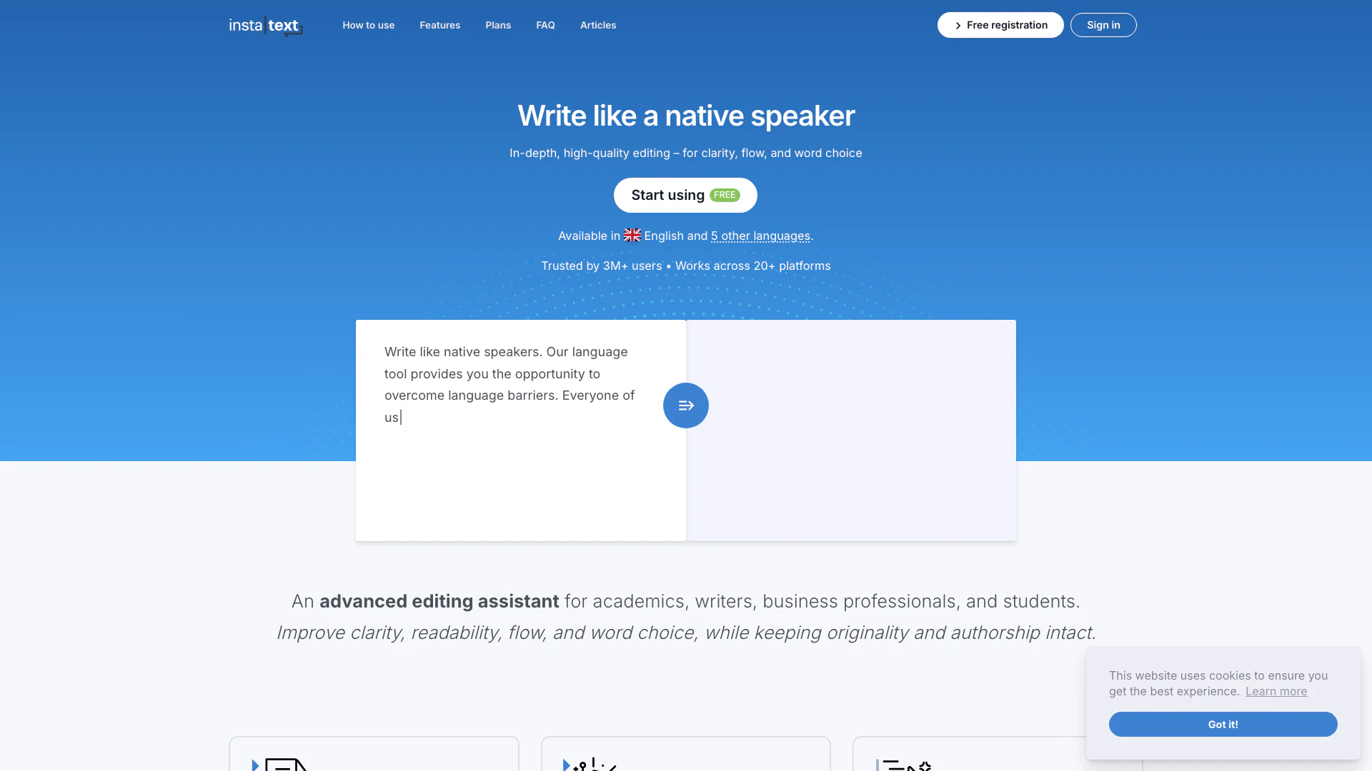 InstaTextがあなたのために何ができるかを探ってみてください。使用は制限されており、1日に5回の改善、一度に1500文字を改善、クレジットカードは不要です。