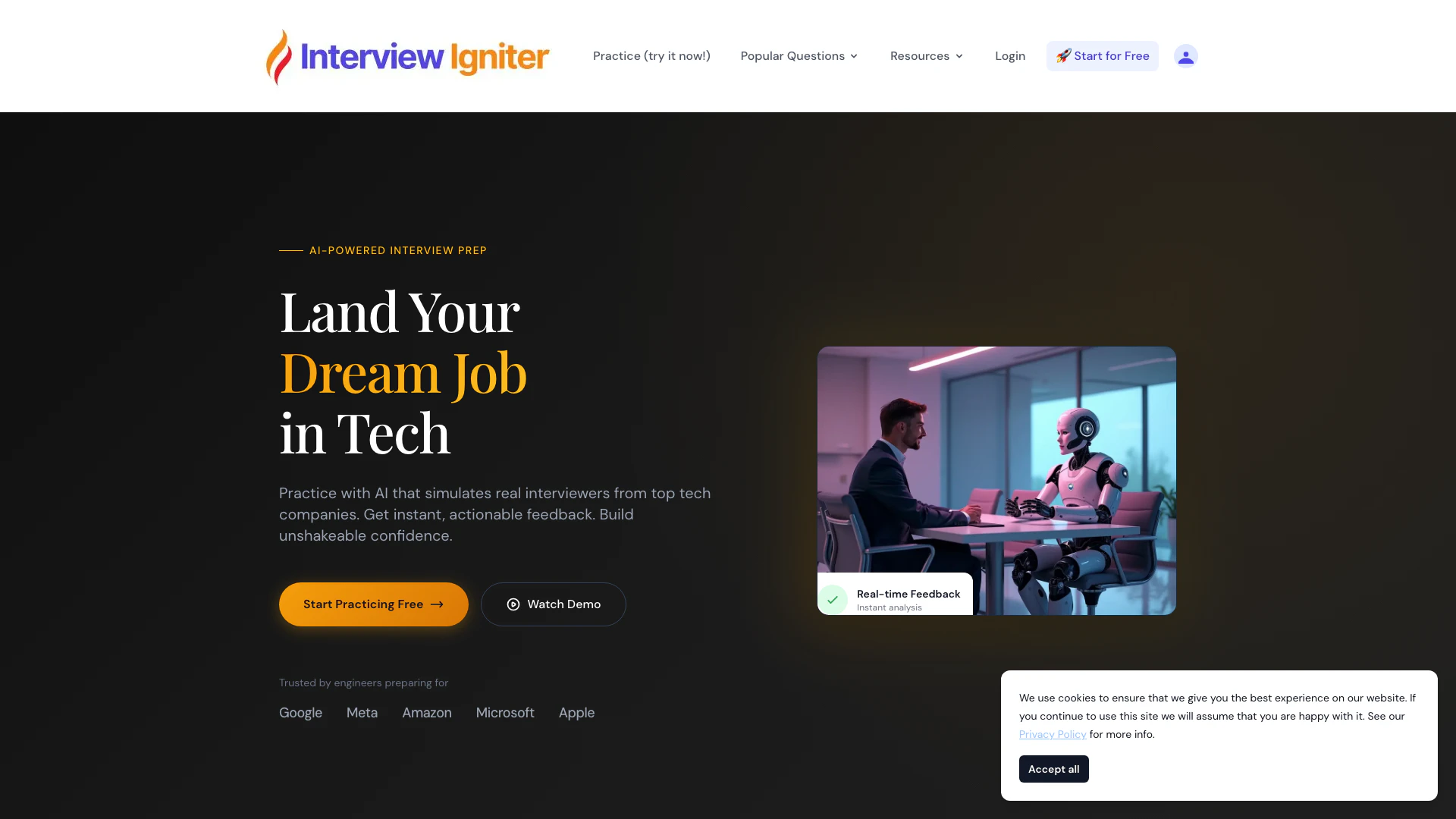 InterviewIgniterは、特にテクノロジー業界での職を目指す求職者のために設計されています。エンジニア、開発者、そしてGoogle、Amazon、Microsoftなどの主要なテクノロジー企業での面接に備えている他の技術専門家に対応しています。このプラットフォームは、面接スキルを向上させ、自信を得て、パフォーマンスに関するパーソナライズされたフィードバックを受けたいと考えている個人にも適しています。最近卒業したばかりの方や、転職を考えている経験豊富な専門家にとっても、InterviewIgniterは成功を収めるための貴重なリソースを提供します。