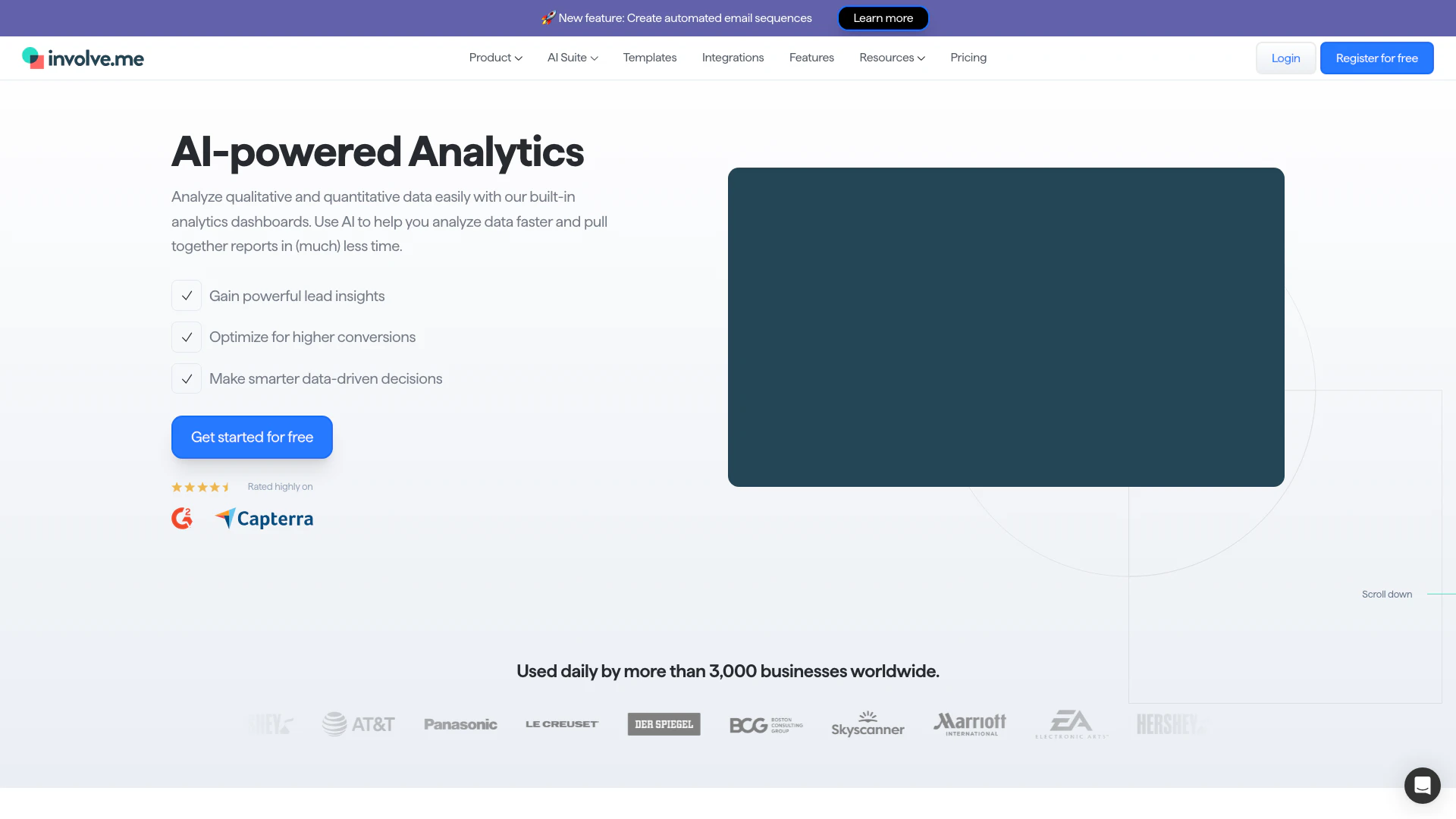 Involveは、ユーザーが定性的および定量的データを直感的な組み込みダッシュボードを通じて分析するのを支援するAI駆動の分析ツールです。人工知能を活用してデータ分析プロセスを合理化し、レポート生成を迅速化することで、企業が複雑なデータを迅速に実用的な洞察に変えることを可能にします。このツールは、データ駆動の洞察を効果的に活用して意思決定能力を向上させたい組織に特に有益です。