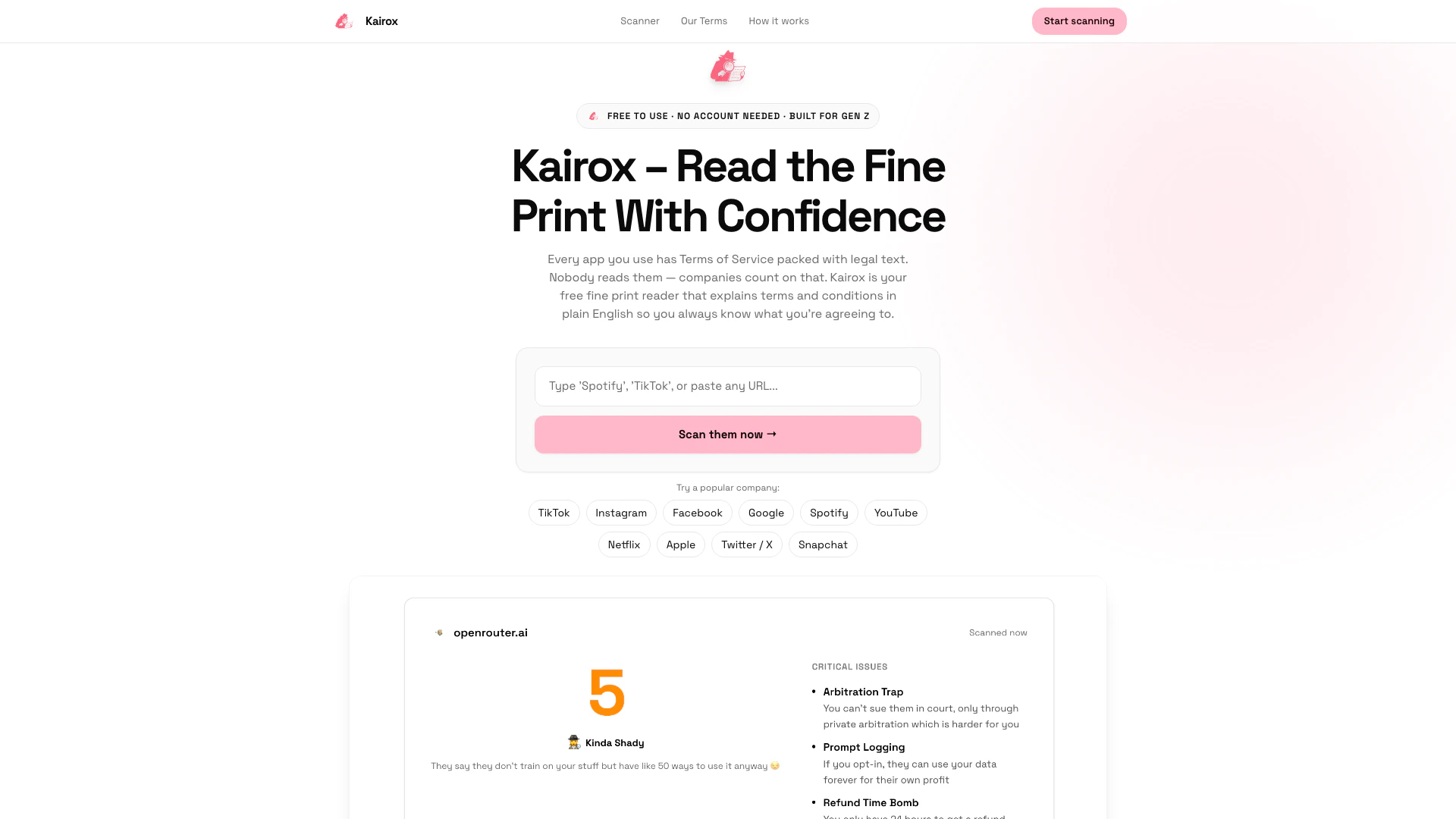 - 無料で使用可能: Kairoxはサービスを完全に無料で提供し、ユーザーが金銭的な負担なしに利用規約をスキャンできるようにしています。