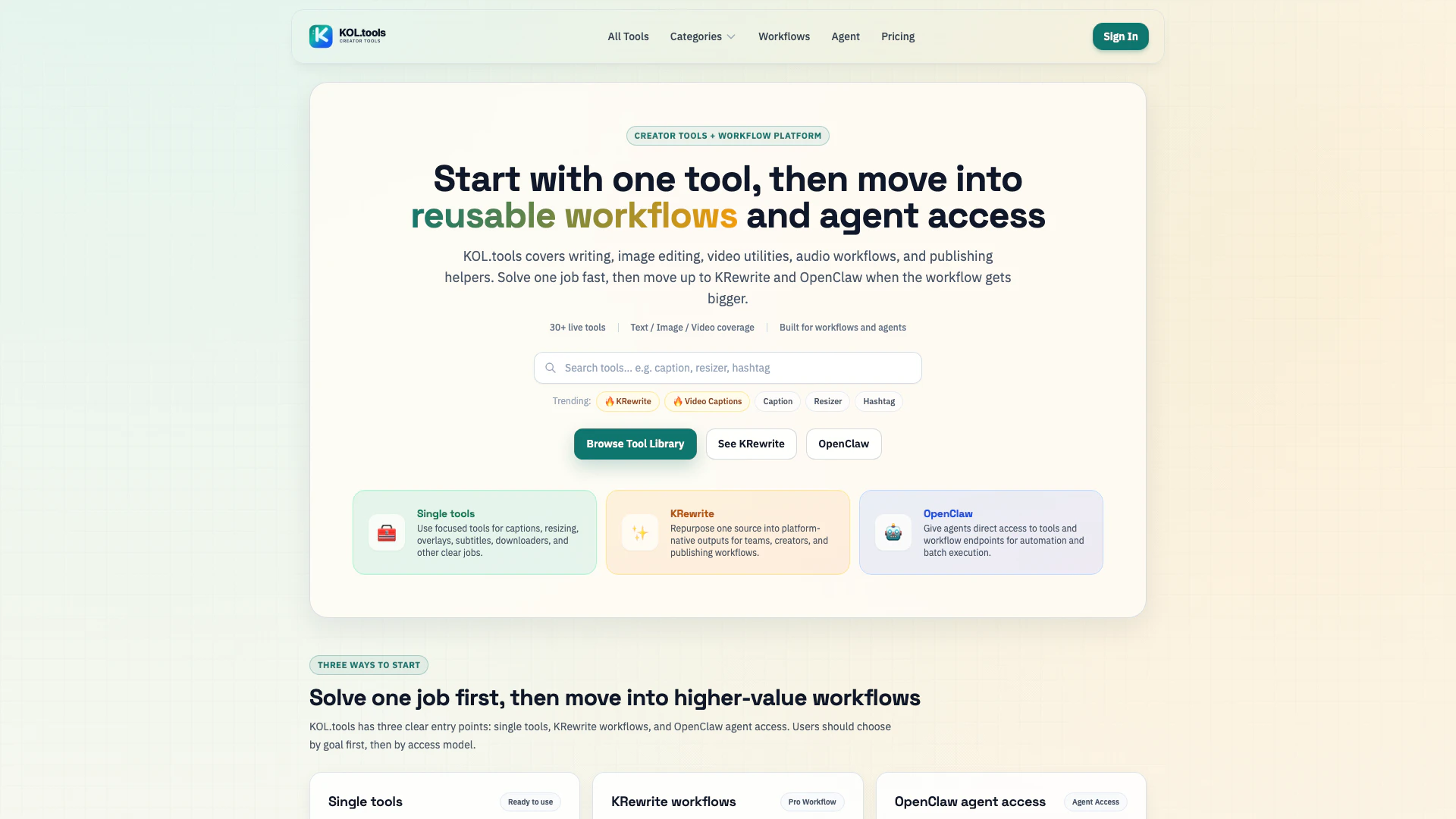 Kolは、テキスト、画像、動画、音声など、さまざまなメディアタイプのコンテンツ作成を効率化するために設計された包括的なクリエイター向けツールプラットフォームです。キャプションの作成、画像のリサイズ、字幕の生成など、特定のタスクを迅速に実行できるツールのスイートを提供しています。さらに、KRewriteのような機能を通じて、プラットフォームに最適化された形式にコンテンツを再利用するのを助けるなど、より複雑なワークフローもサポートします。また、OpenClawは、チーム向けの自動化および統合機能を提供します。このプラットフォームは、個々のクリエイターと大規模なチームの両方に対応できるように構築されており、さまざまなコンテンツ制作ニーズに対応する柔軟性を持っています。