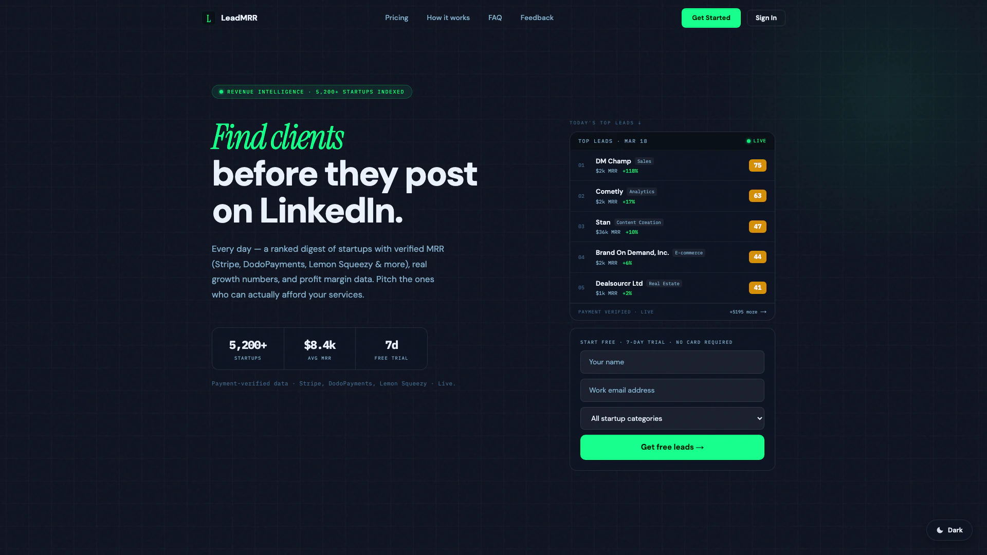 Leadmrrは、サービスに対して実際の予算を持つスタートアップとつながりたいエージェンシーやフリーランサーのために特別に設計された収益インテリジェンスツールです。Stripeの月次定期収入(MRR)、30日間の成長率、利益率などの検証済みの指標に基づいてランク付けされた、10〜20の事前選定されたスタートアップリードの毎日のダイジェストを提供することで、Leadmrrはユーザーが自分のサービスを提供できる財政的能力を持つスタートアップにアプローチできるようにします。このツールは5,200以上のスタートアップをインデックス化し、ユーザーが予算のないスタートアップへのコールドアウトリーチの落とし穴を避けるのに役立つ洞察を提供します。