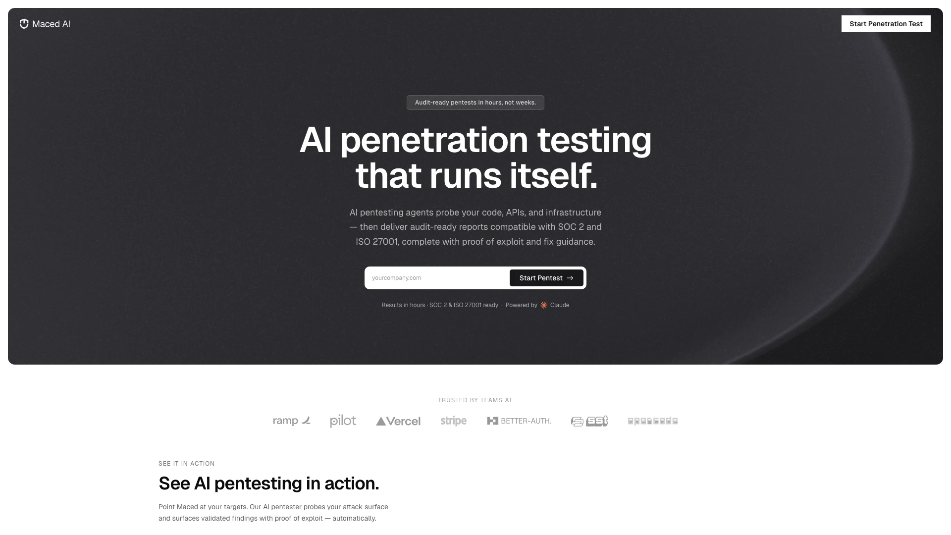 Macedaiは、自律型のAI駆動のペネトレーションテストプラットフォームで、数週間ではなく数時間で監査準備が整ったペンテストを提供するように設計されています。高度なAIペンテストエージェントを活用して、コード、API、およびインフラストラクチャを調査し、実際の脆弱性を特定、検証、悪用します。このプラットフォームは、SOC 2およびISO 27001基準に準拠した詳細なレポートを生成し、悪用の証拠と修正ガイダンスを含むため、効率的にセキュリティ姿勢を強化したい組織にとって不可欠なツールです。