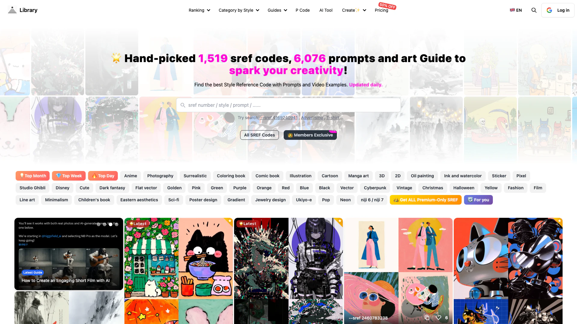 - スタイル別に分類されたsrefコードとプロンプトの広範なライブラリをブラウズします。