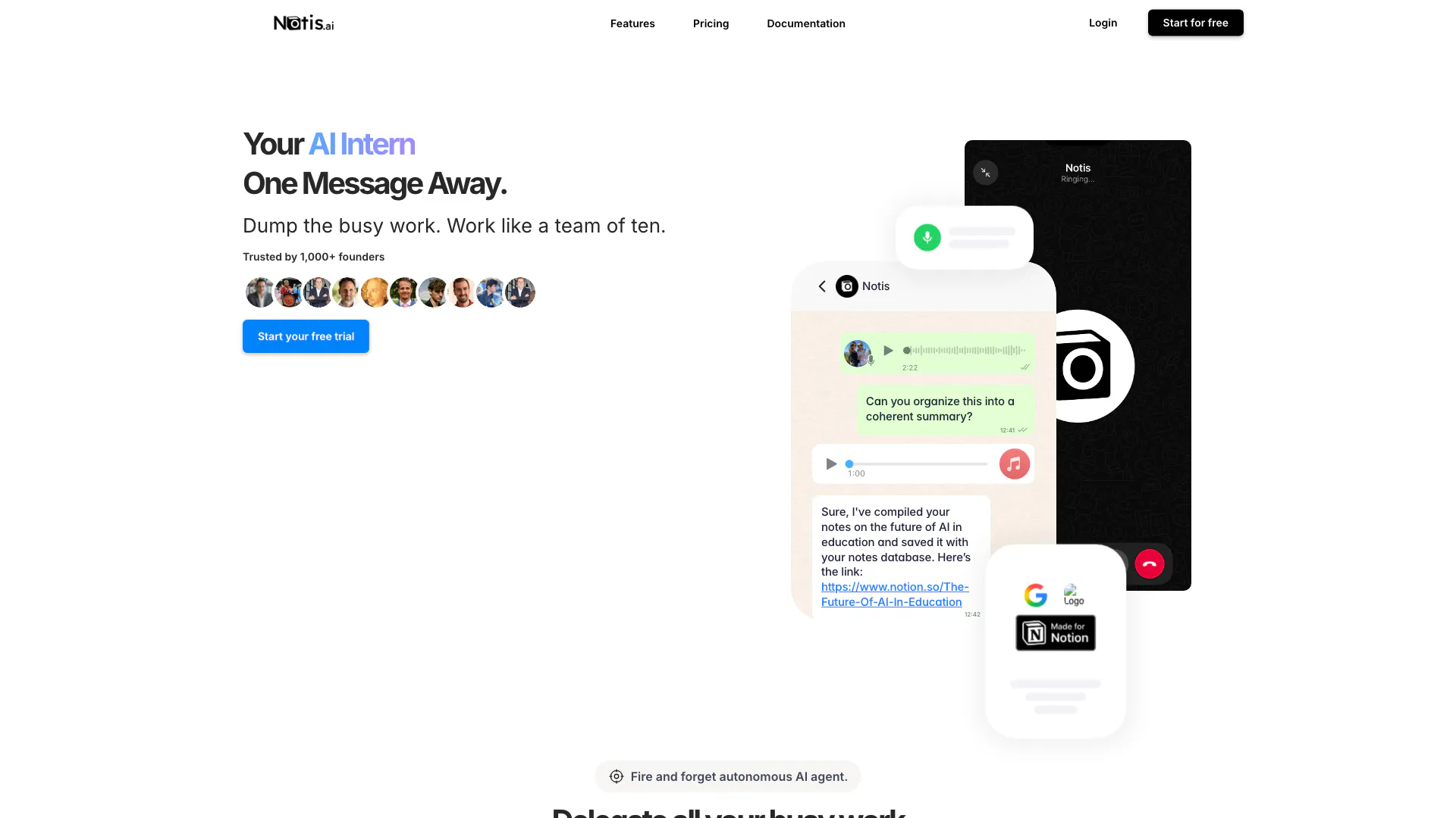 Notisは、ユーザーが音声で指示を出すと、すべての煩雑な作業を自動的に処理するAIアシスタントです。1,000人以上の創業者に信頼されており、チームのように働くことができます。会議の議事録、ブログ記事、CRMの更新など、さまざまな作業を簡単に管理できる生産性ツールです。