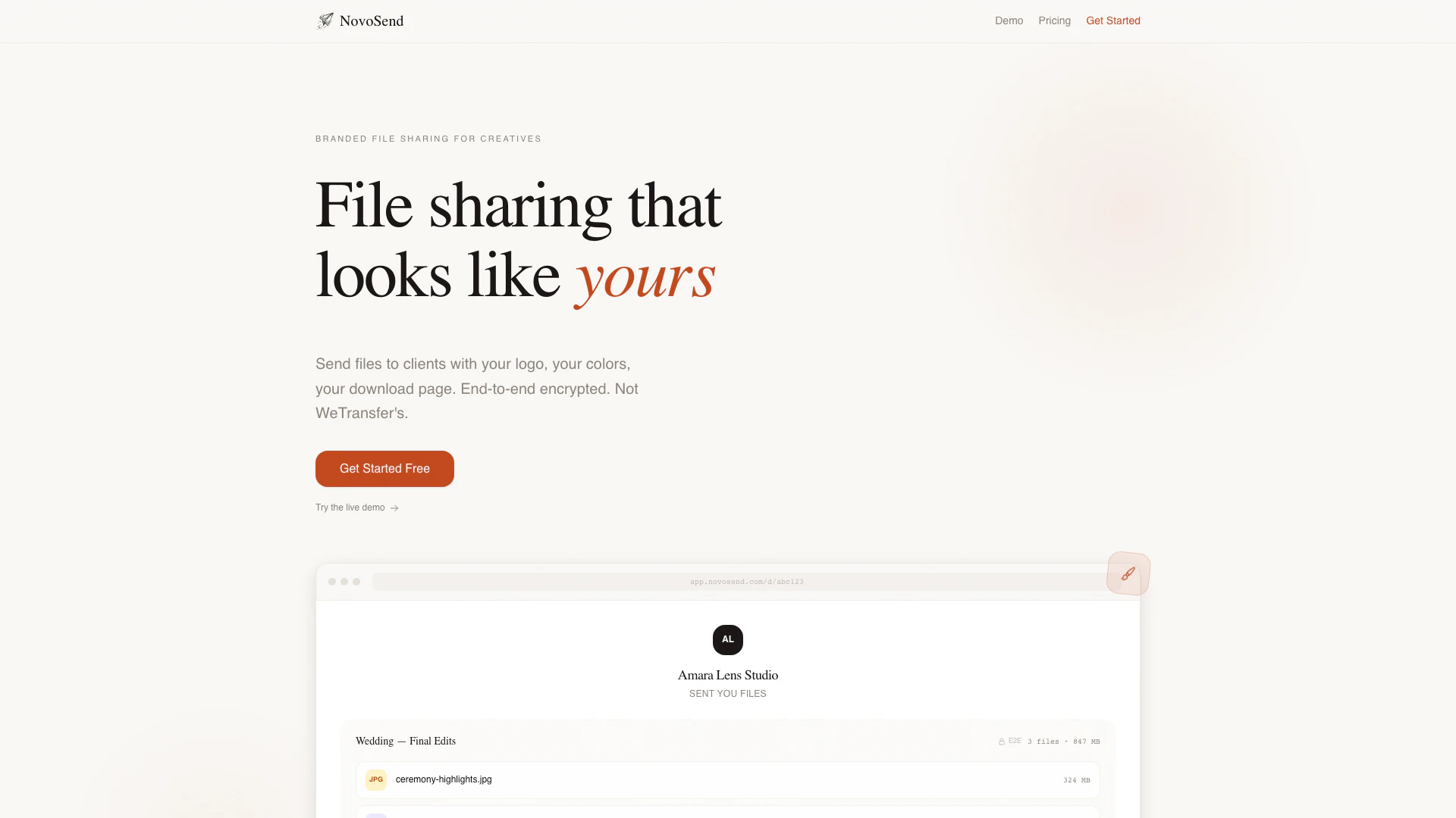NovoSendは、写真家、デザイナー、フリーランサーなどのクリエイティブ専門家向けに特別に設計されたホワイトラベルのファイル共有プラットフォームです。ユーザーは、カスタムロゴや色を使用して、ブランド化された方法でクライアントにファイルを送信できます。ダウンロードページはユーザーのブランドアイデンティティを反映します。エンドツーエンドの暗号化により、NovoSendはWeTransferのような従来のファイル共有サービスに代わる安全な選択肢を提供し、クリエイティブが大きなファイルを共有する際にプロフェッショナルを維持できるようにします。