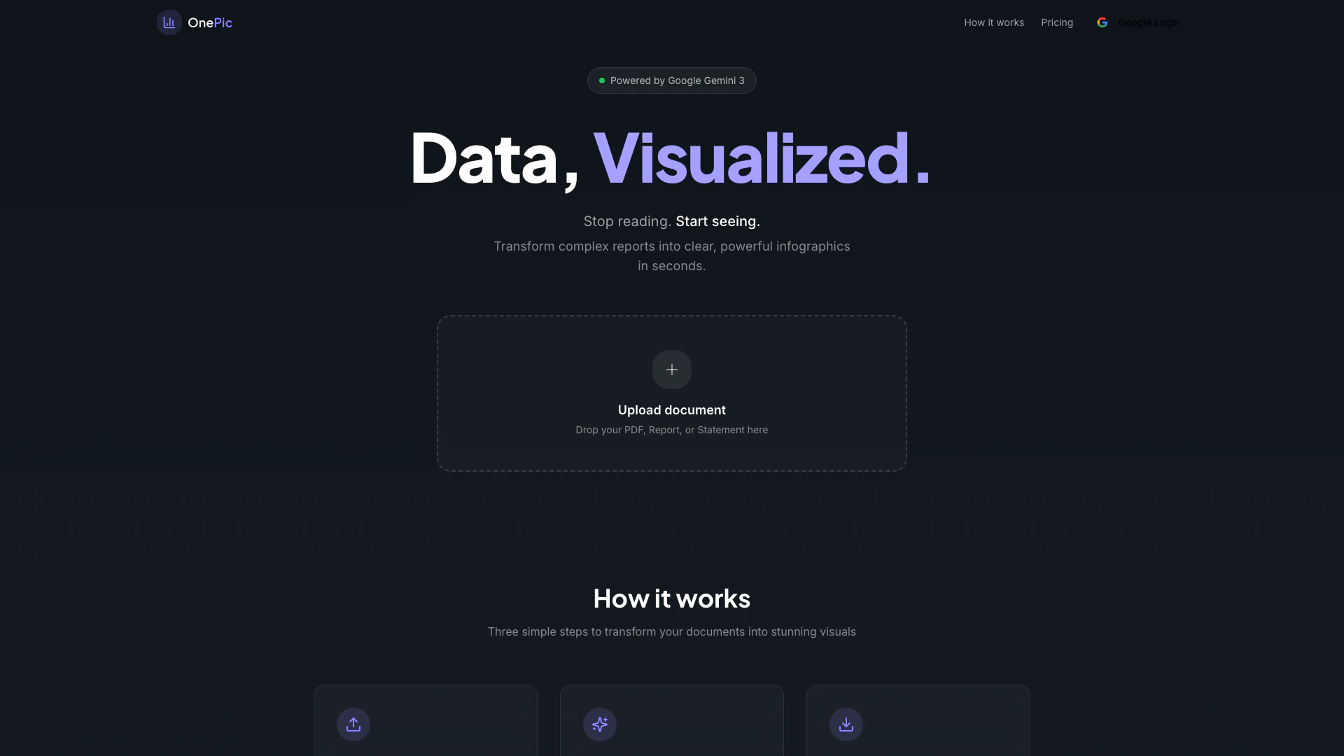 Onepicaiは、複雑な文書を視覚的に魅力的なインフォグラフィックやチャートに変換するために設計された革新的なAI駆動ツールです。Google Gemini 3を含む高度な技術を活用することで、Onepicaiはデータ視覚化のプロセスを簡素化し、ユーザーが財務報告書、研究論文、その他のテキストベースの文書を数秒で明確で魅力的なビジュアルに変換できるようにします。その核心的な価値は、データをよりアクセスしやすく、理解しやすくすることにあり、専門家が洞察を効果的に伝えることを可能にします。