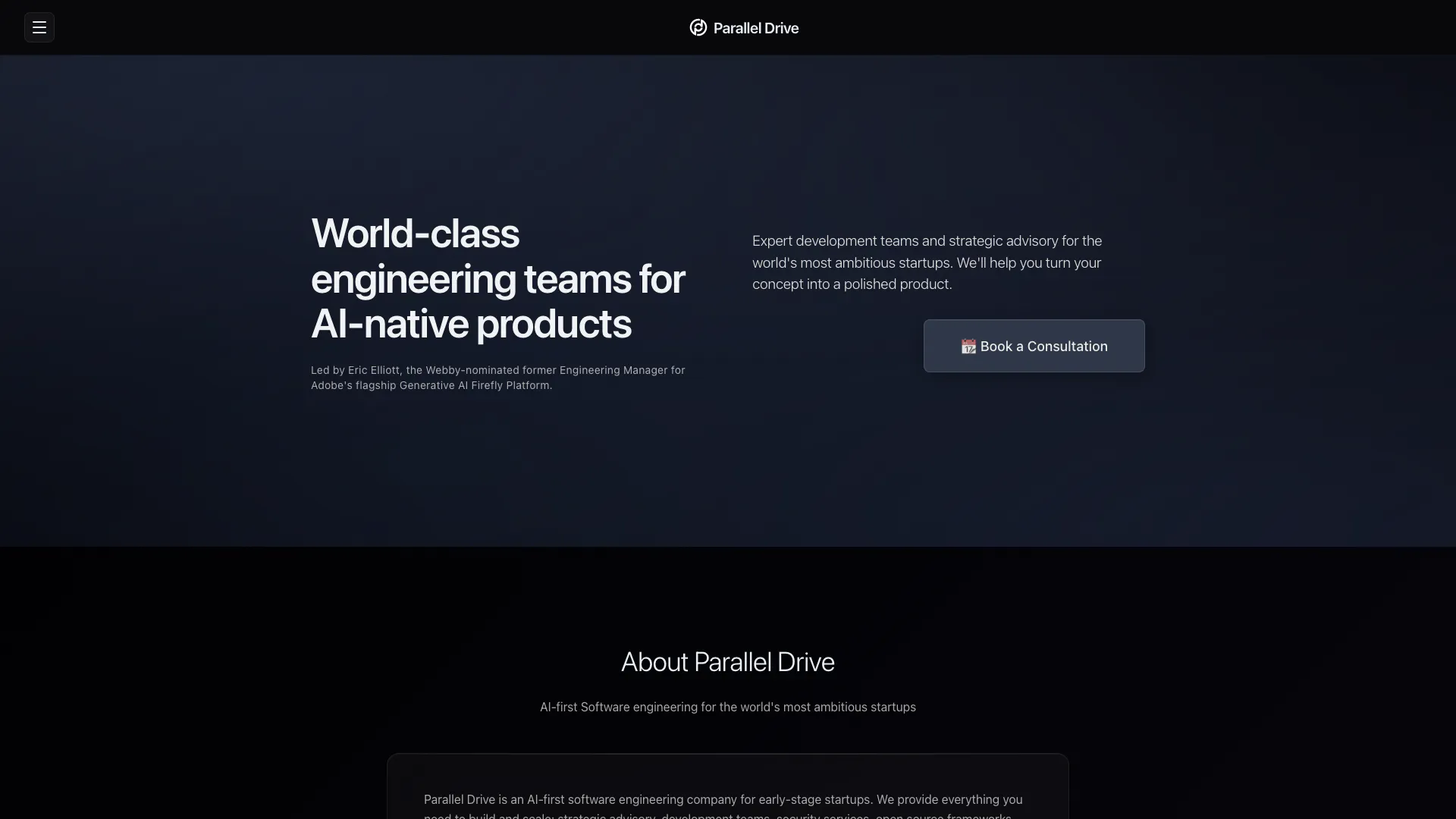 パラレルドライブは、AI駆動の開発を専門とする戦略的アドバイザリーおよびエキスパートエンジニアリング会社です。野心的なスタートアップのためのAIファーストのソフトウェアエンジニアリングパートナーとして位置づけられ、パラレルドライブは戦略的アドバイザリー、開発チーム、セキュリティサービス、クラウドAIエージェントインフラストラクチャなど、幅広いサービスを提供しています。会社は、Adobeの生成AIファイヤーフライプラットフォームの元エンジニアリングマネージャーであるエリック・エリオットによって運営されており、高品質なエンジニアリングプラクティスが保証されています。パラレルドライブのコアバリューは、スケールするインテリジェントシステムの構築にあり、隔週のデモを通じて透明性を提供し、各スタートアップのユニークなニーズに応じたカスタマイズされたソリューションを提供することです。