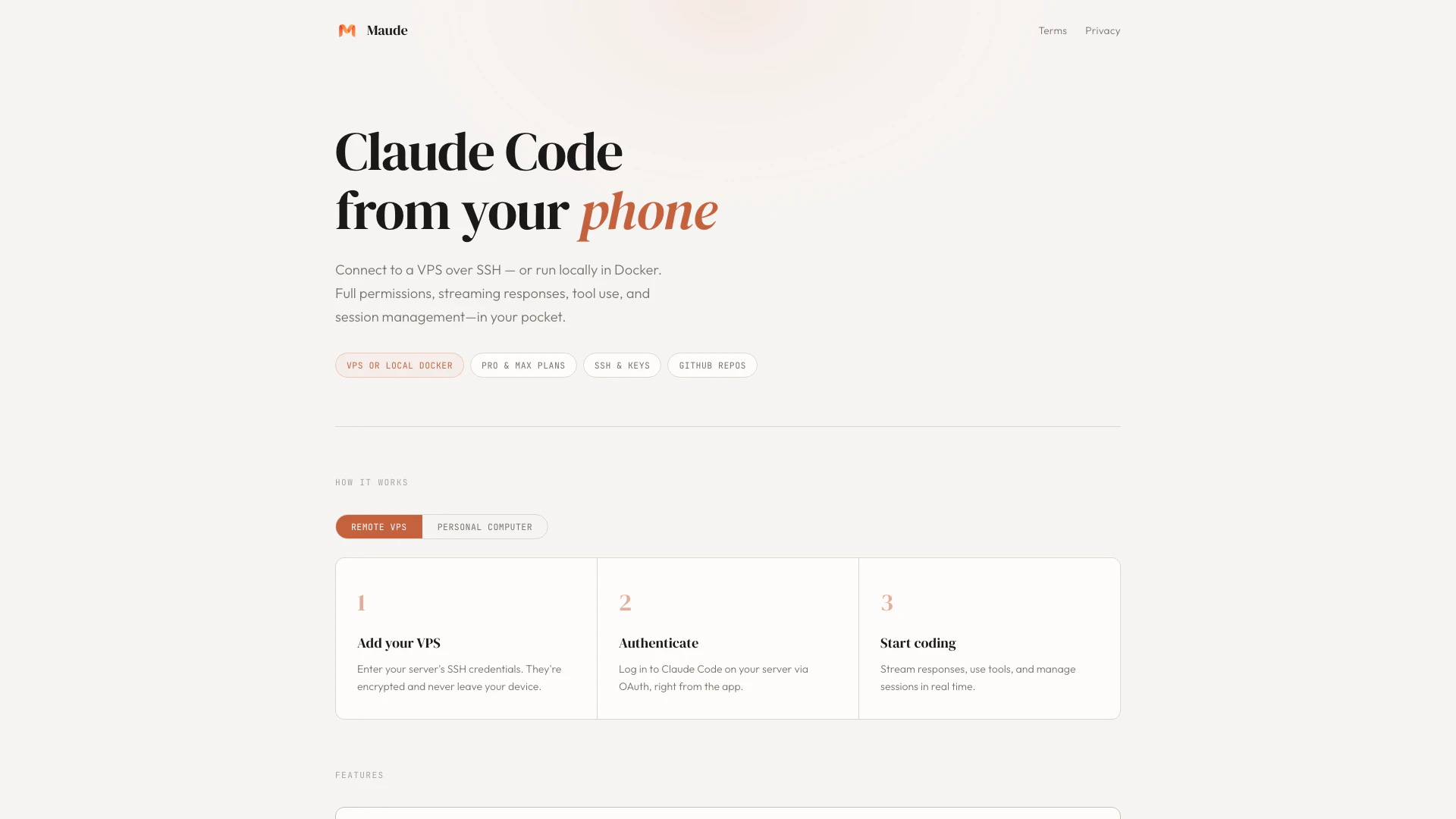 - 環境を完全に制御: Maudeは、ユーザーが自分のVPSまたはローカルDockerコンテナに接続できるようにし、中断なしにコーディング環境を完全に制御するための権限を提供します。