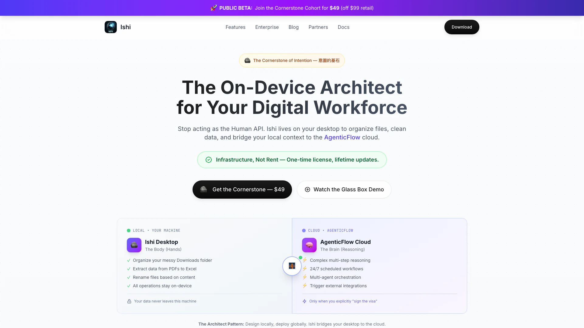 Ishi Desktopの生涯ライセンスを取得し、無制限のローカル実行、Skill Marketplace内の100以上のプレミアムスキルへのアクセス、優先サポート、すべての将来のV1.xアップデートが含まれます。これは一度きりの支払いで、月額料金は一切ありません。