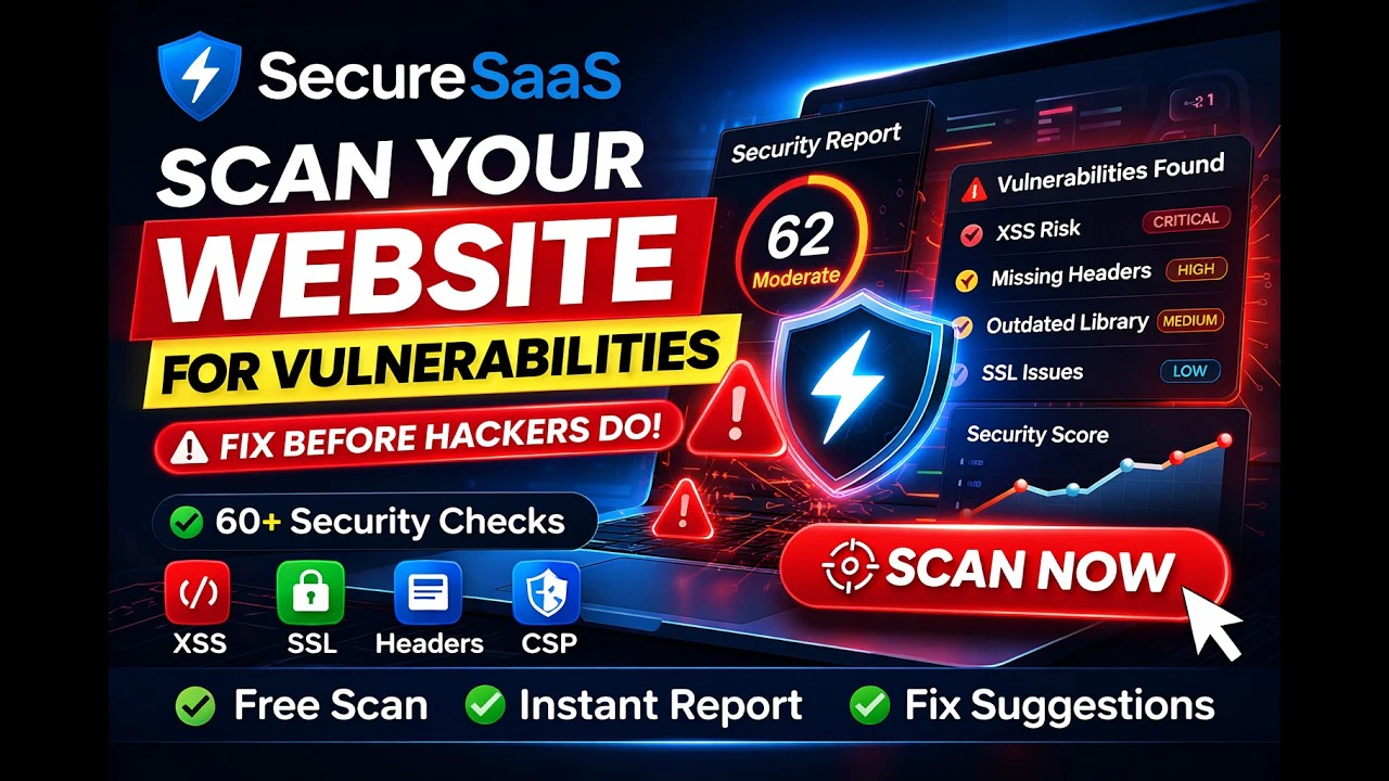 ウェブサイトの脆弱性スキャナーは、セキュリティの欠陥を検出するためにウェブアプリケーションをスキャンする自動化ツールです。サイトをクロールし、XSS、CSRF、欠落したセキュリティヘッダー、SSLの誤設定、公開されたファイルなどの既知の脆弱性を分析します。SecureSaaSは60以上の自動脆弱性チェックを実行し、深刻度評価と修正提案を含むレポートを生成します。