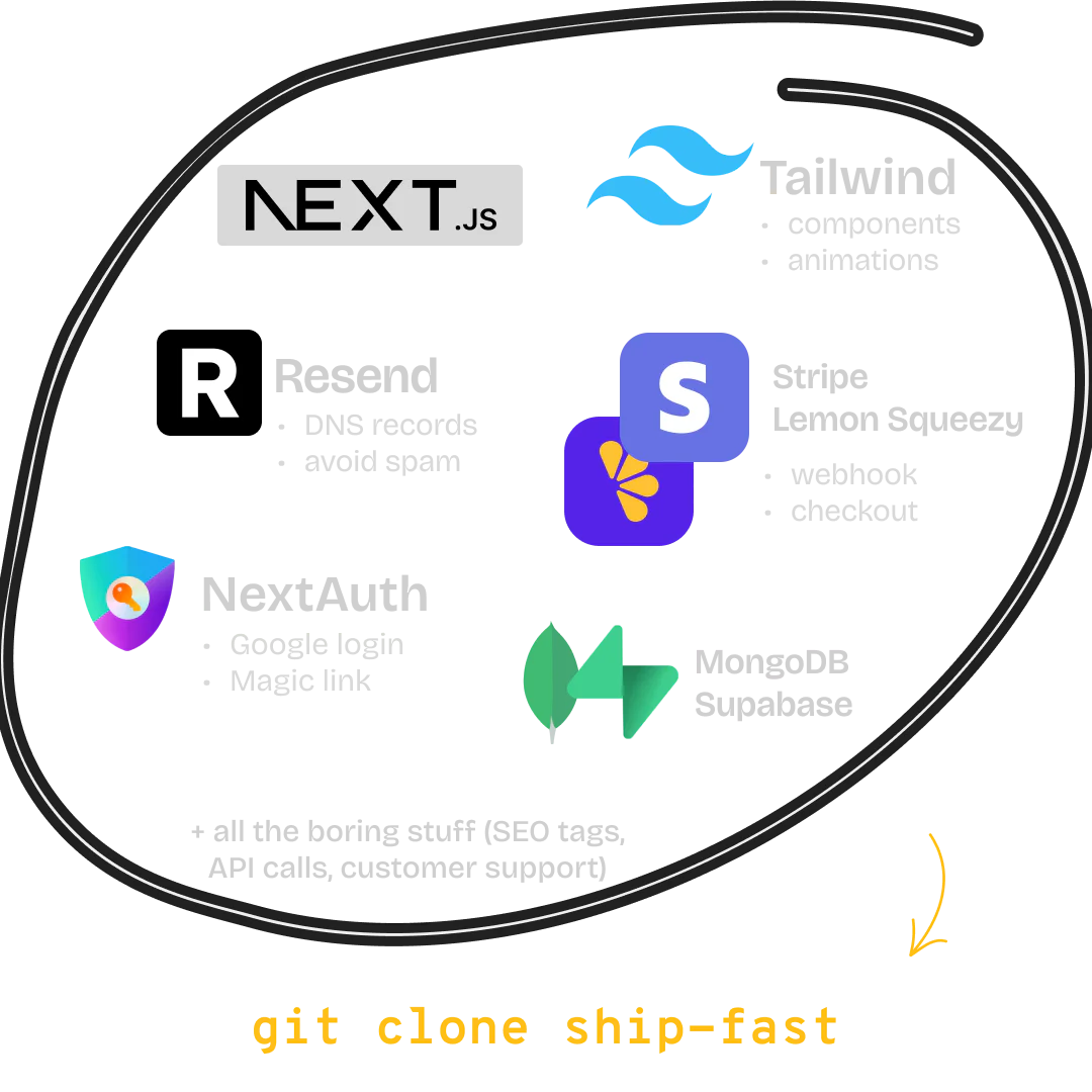 - 迅速なセットアップとローンチ: ShipFastは、ユーザーがわずか5分でウェブアプリケーションを設定できるようにし、アイデアから製品化までの時間を大幅に短縮します。