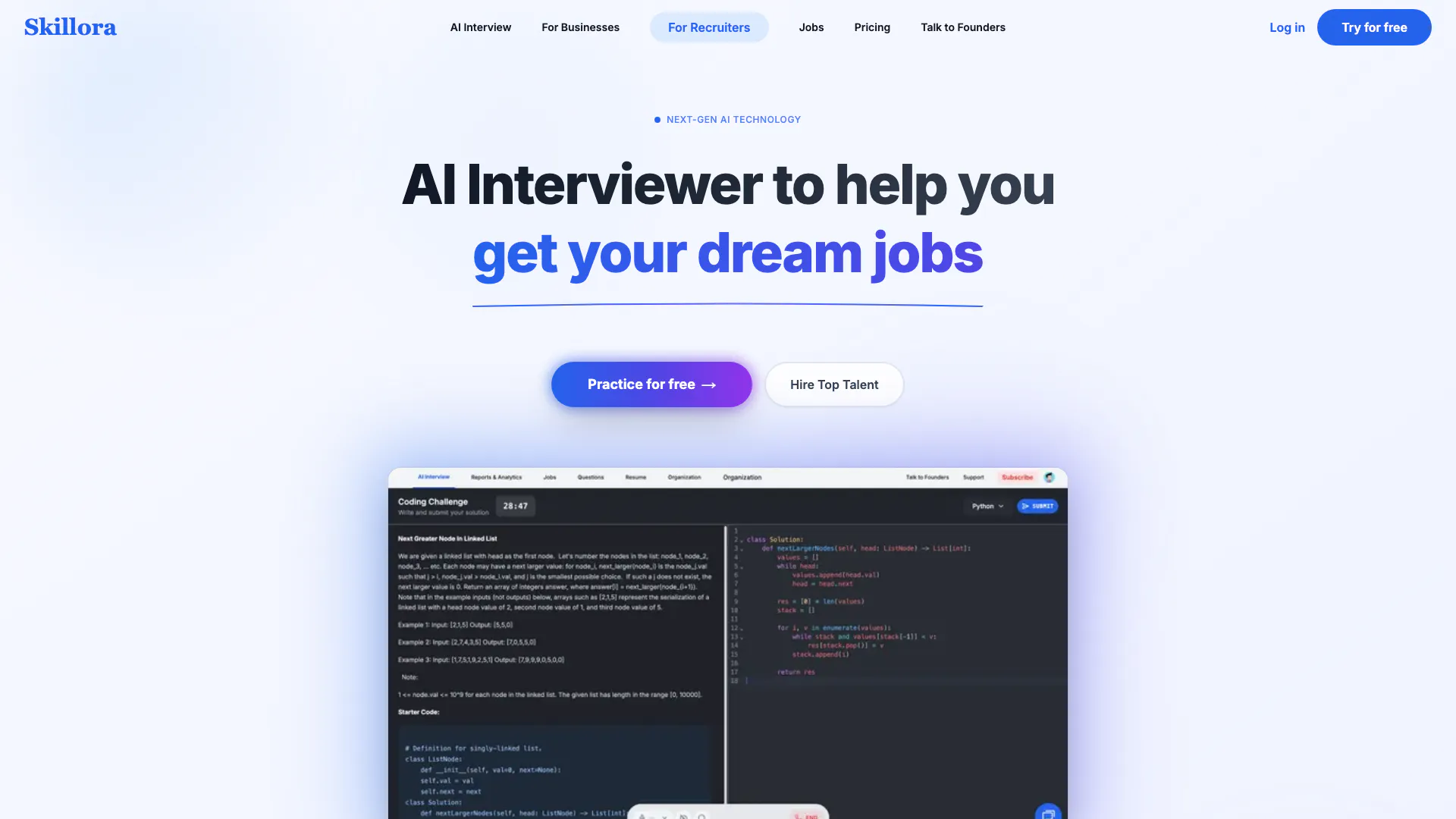 Skilloraaiは、採用プロセスを効率化し、求職者の面接準備を向上させるために設計された最先端のAI面接プラットフォームです。高度な自動化を活用することで、Skilloraaiは採用担当者が候補者を効率的にスクリーニングし評価することで、より早く採用できるよう支援します。求職者にとっては、さまざまな役割の面接を練習し、即座にフィードバックを受け取り、履歴書を最適化するユニークな機会を提供し、最終的には夢の仕事を得るチャンスを向上させます。