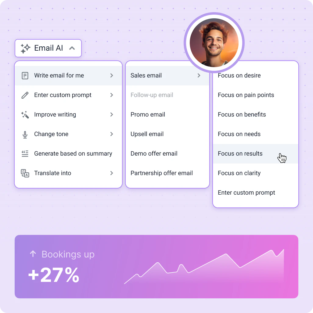 - メールコピーを生成: AIに数秒で構造化されたパーソナライズされたメールを生成させ、魅力的な件名を含めます。