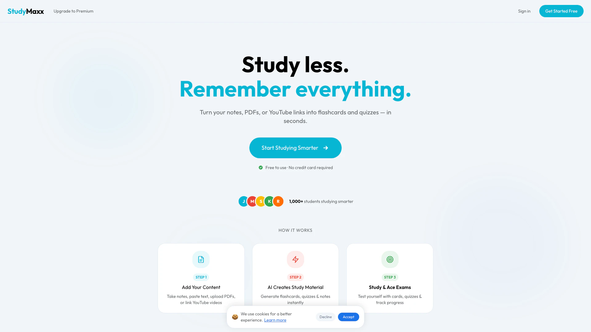 Studymaxxは、学習効率を高め、試験のパフォーマンスを向上させたい学生のために主に設計されています。ノート、講義、またはオンラインリソースから迅速に学習資料を作成する必要がある高校生や大学生に最適です。試験、クイズの準備をしている場合や、学習を強化したい場合でも、Studymaxxはさまざまな学問的ニーズに対応します。