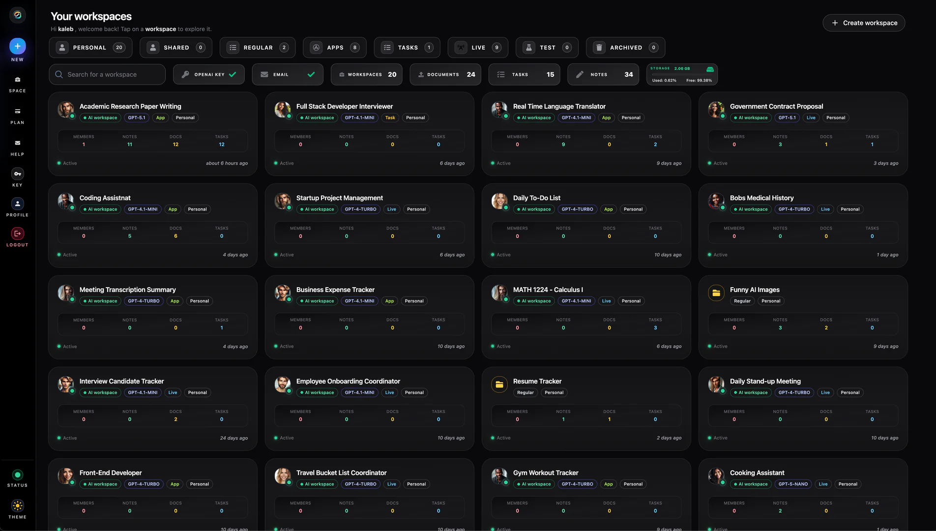 - 構成可能なワークスペース: チームやプロジェクトのために専用のスペースを作成し、特定のワークフローに合わせてエージェントのペルソナをカスタマイズします。