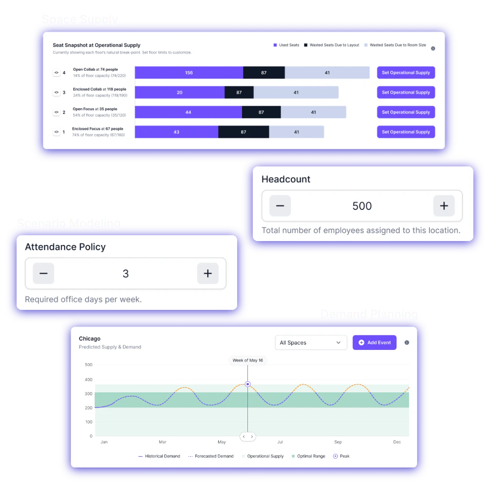 - シナリオモデリング: スペースの利用を向上させ、従業員の満足度を高めるために、さまざまな職場シナリオを作成し評価します。