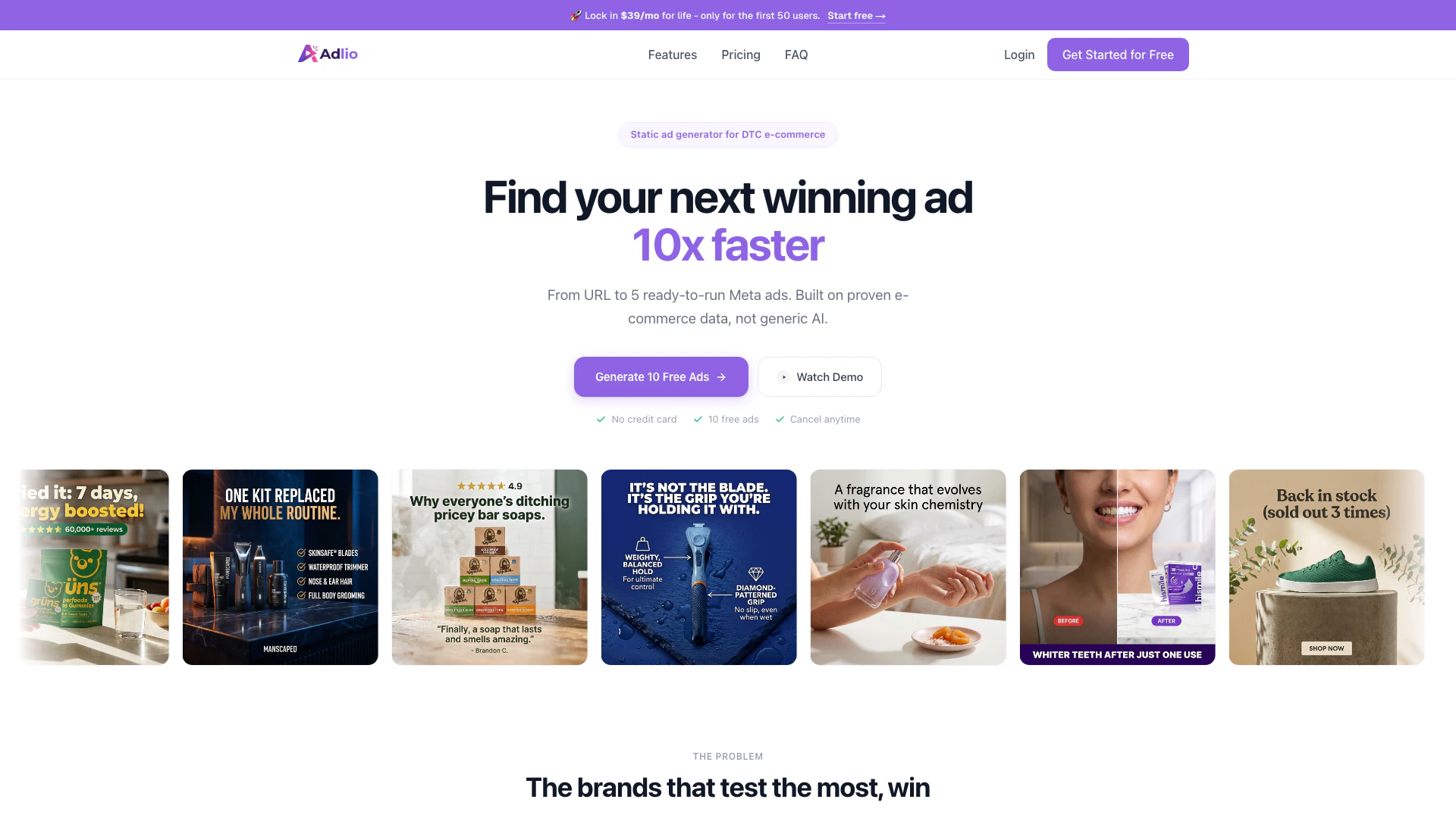 대부분의 AI 광고 도구는 일반적입니다. 그들은 모든 비즈니스를 위한 광고를 만듭니다. Adlio는 DTC 전자상거래를 위해 특별히 제작되었습니다. 우리는 10개 이상의 검증된 광고 형식, 청중 온도에 따라 정리된 350개 이상의 훅 데이터베이스, 자동 브랜드 매칭을 보유하고 있습니다. 모든 형식과 훅은 전자상거래를 위한 메타 광고에서 실제로 효과가 있는 것을 기반으로 합니다.