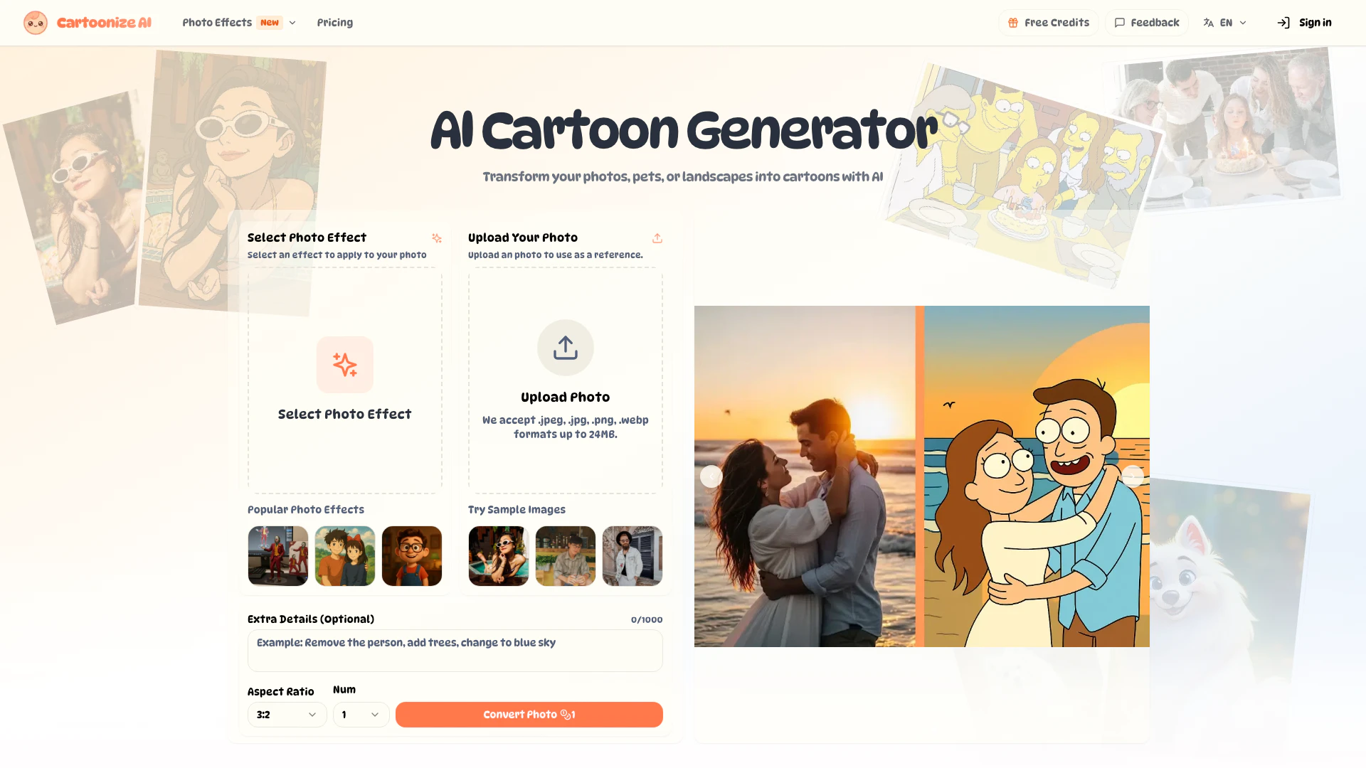 - AI 기반 만화화: 고급 AI 기술을 사용하여 사진, 애완동물 또는 풍경을 생동감 있는 만화로 변환하여 예술적인 이미지를 쉽게 만들 수 있습니다.