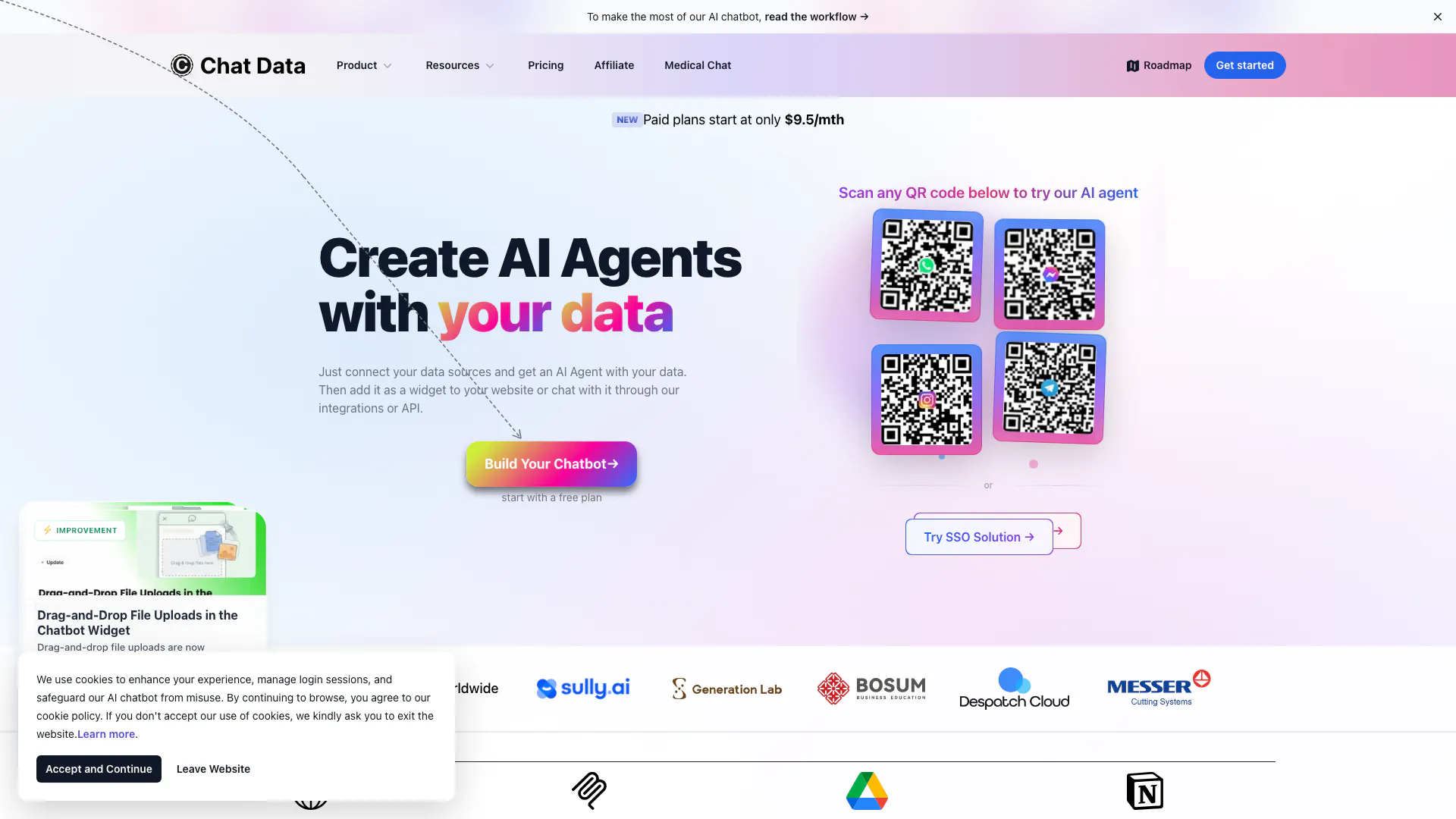 Chat Data allows users to build custom AI agents and chatbots for customer support automation, which can be deployed to various platforms including websites, WhatsApp, Slack, Instagram, and more.