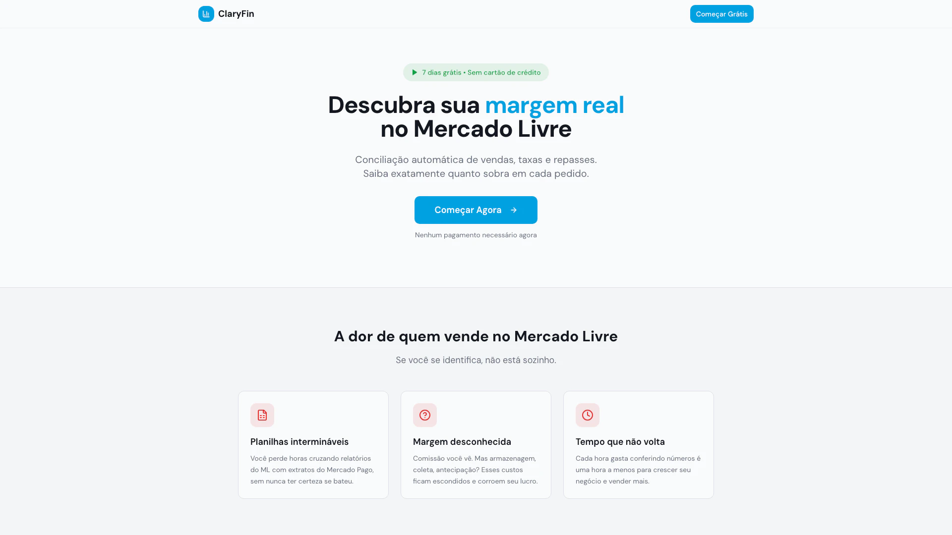 ClaryFin은 Mercado Livre의 판매자를 위해 설계된 재무 조정 도구입니다. 이 도구는 판매, 수수료 및 결제를 자동으로 조정하여 사용자가 실제 이익률을 발견하는 데 도움을 줍니다.