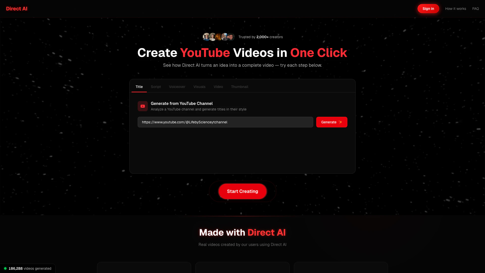 내 비디오는 너무 전문적으로 보여서 사람들이 내가 몇 분 안에 만들었다는 것을 믿지 못합니다. 지난주에 하나의 비디오가 40만 조회수를 기록했습니다. Direct AI는 너무 쉽게 만들어줍니다.