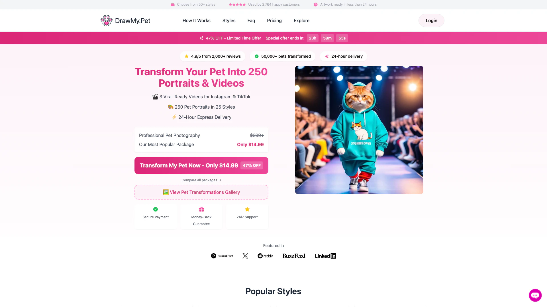 Drawmy는 반려동물을 멋진 현대 미술 걸작으로 변환하는 혁신적인 온라인 플랫폼입니다. 50가지 이상의 독특한 스타일 중에서 선택할 수 있는 이 서비스는 개인화된 선물을 만들거나, 집 장식을 향상시키거나, 소셜 미디어에서 반려동물의 디지털 존재감을 높이는 데 완벽합니다. 각 작품은 정성스럽게 제작되며, 전 세계 수천 명의 만족한 고객들로부터 찬사를 받았습니다. Drawmy는 24시간 이내에 고품질의 예술적 반려동물 표현을 제공하는 것을 자랑하며, 반려동물을 기념하고자 하는 반려동물 소유자에게 빠르고 즐거운 옵션입니다.