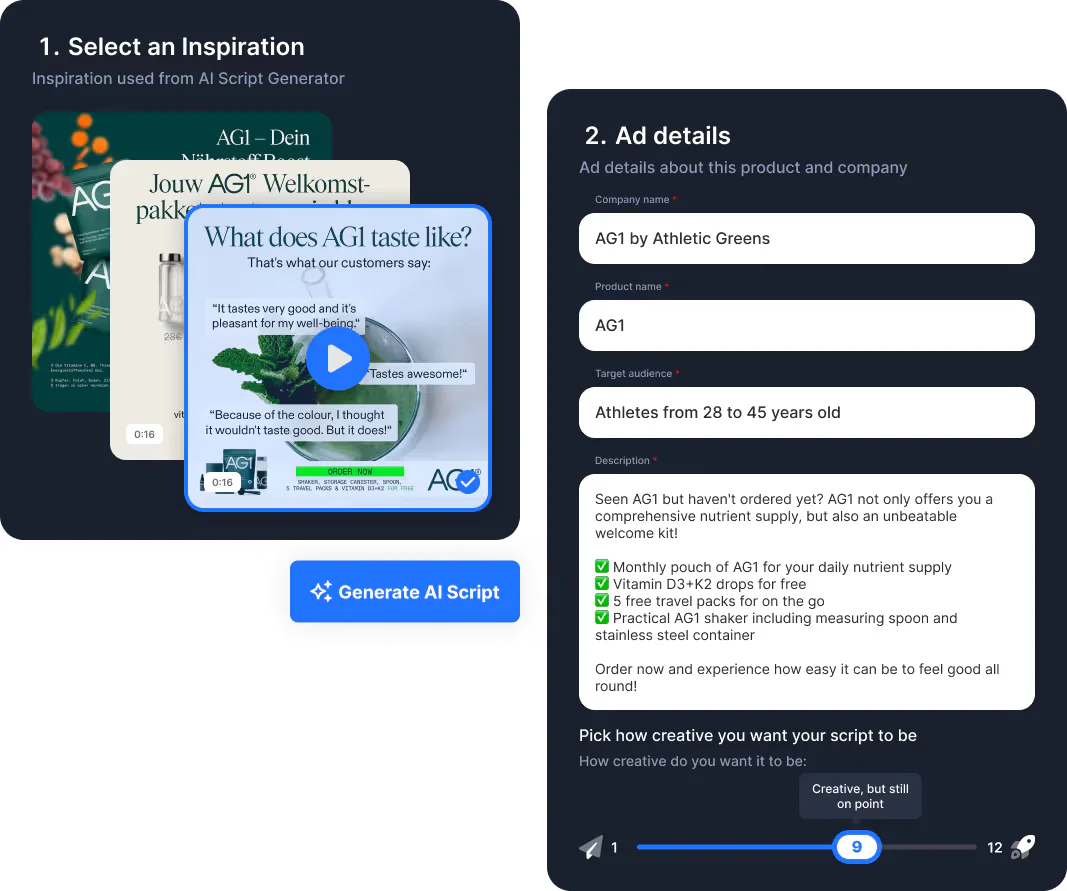 - AI 생성 스크립트: 브랜드의 메시지에 맞춘 고전환 광고 스크립트를 생성하세요.