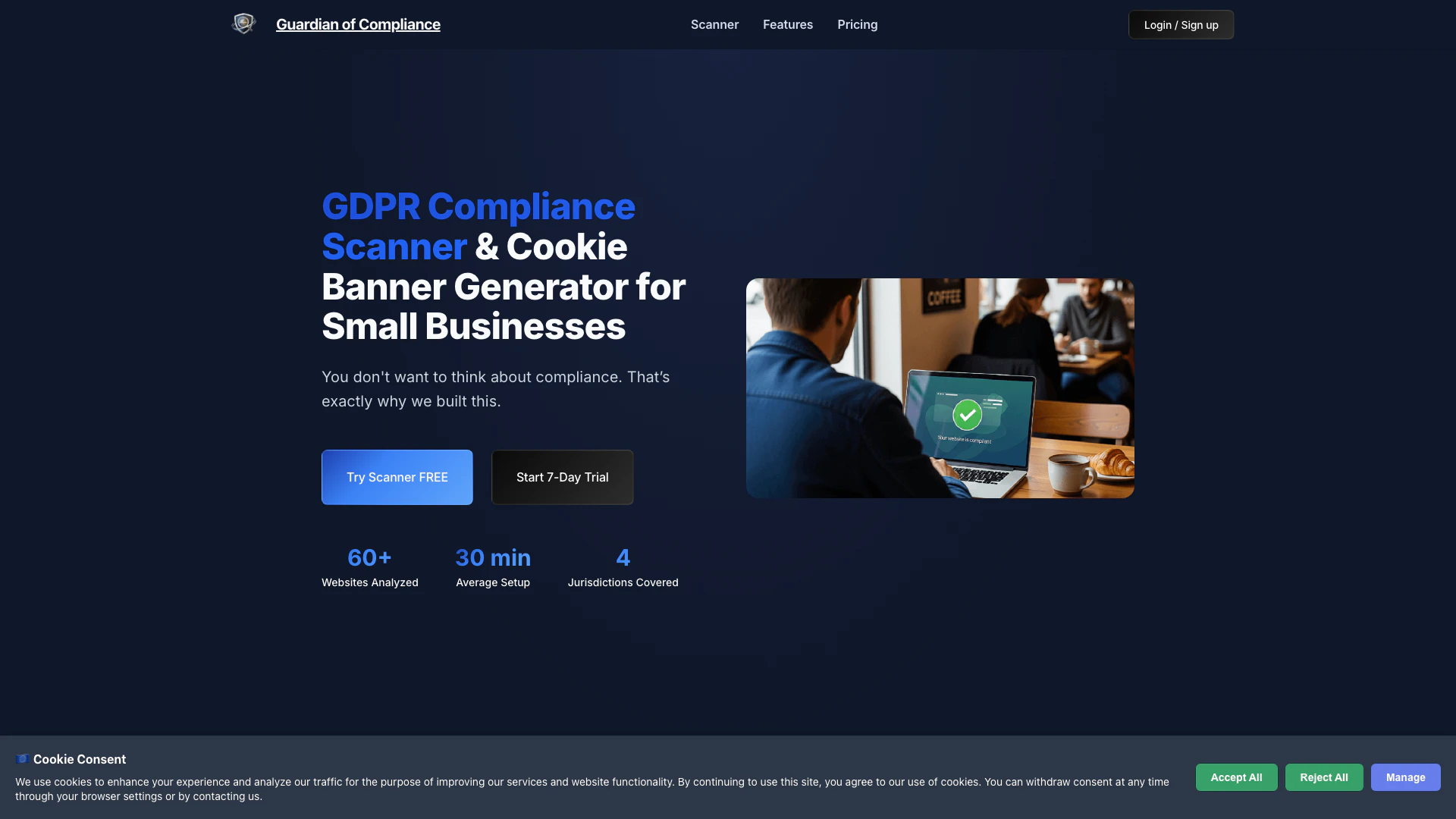 규정 준수의 수호자는 GDPR, CCPA, PIPEDA 및 LGPD 준수 솔루션을 제공하는 저렴한 도구로, 자동 웹사이트 스캔, 쿠키 배너 및 개인정보 보호정책 생성을 포함합니다.