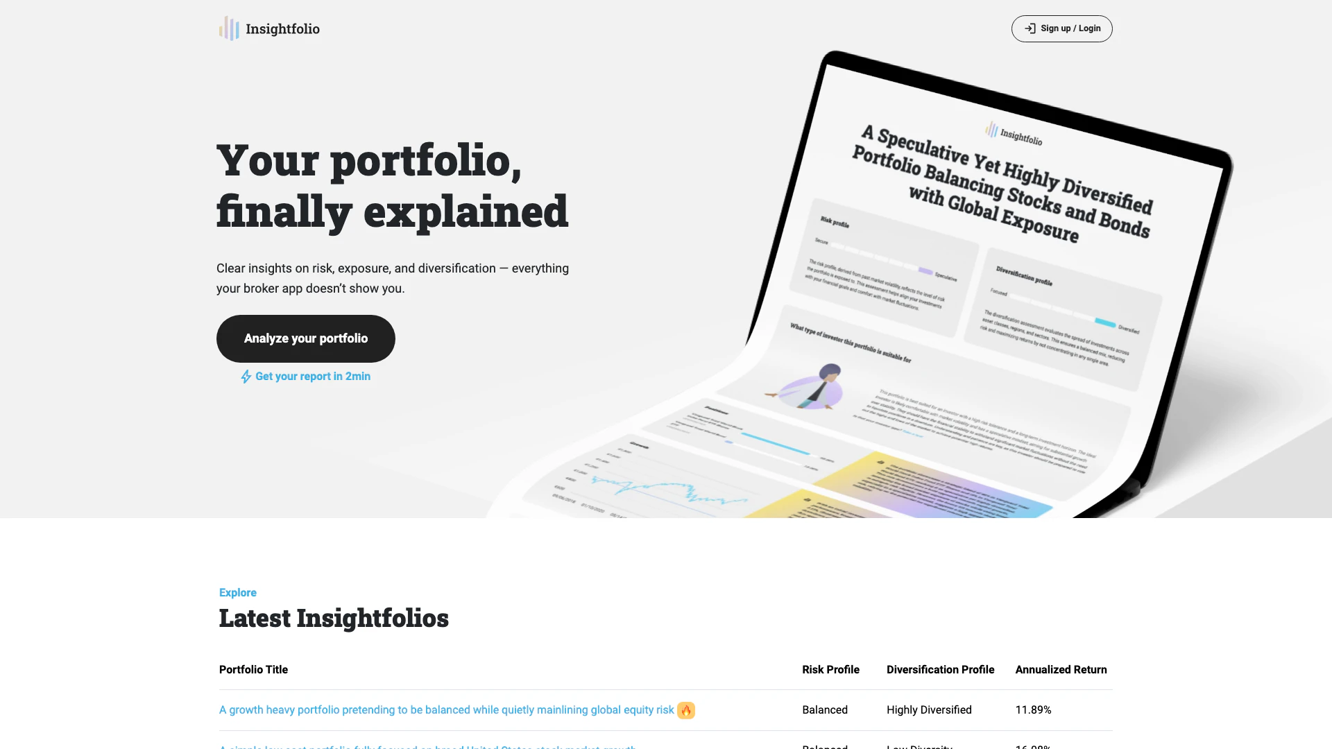 Insightfolio는 귀하의 투자 포트폴리오에 대한 포괄적인 이해를 제공하기 위해 설계된 투자 분석 도구입니다. 분석 기법과 사용자 친화적인 통찰력을 결합하여, Insightfolio는 귀하의 포트폴리오 성과, 위험 수준 및 자산 클래스, 섹터, 지역 간의 다각화를 자세히 분석합니다. 경험이 풍부한 투자자이든 이제 막 시작하는 투자자이든, Insightfolio는 귀하가 명확성을 얻고, 정보에 기반한 결정을 내리며, 투자 목표와 가치에 맞게 투자를 조정하는 데 도움을 줄 수 있습니다.