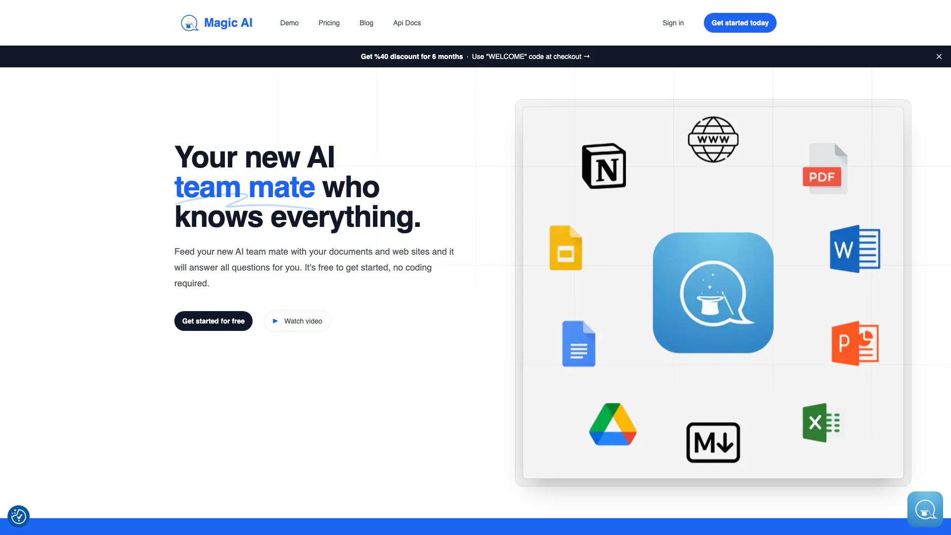 매직 AI는 프로젝트와 회사의 모든 측면을 지원하도록 설계된 새로운 AI 팀원입니다. 이 혁신적인 도구는 지식과 자원을 한 곳에 통합하여 제공하며, 사용자가 제공하는 문서와 웹 콘텐츠를 기반으로 질문에 즉각적인 답변을 제공합니다. 웹사이트용 챗봇을 만들거나 정보를 정리하여 팀 생산성을 향상시키고 싶다면, 매직 AI는 코딩 기술이 필요 없는 포괄적인 솔루션으로 작용합니다.