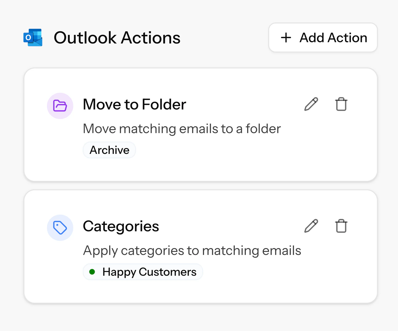 - 이메일 작업 사용자 정의: 즉각적인 주의가 필요하지 않은 이메일을 아카이브하거나 라벨링하는 등 메일위자드AI가 이메일을 처리하는 방식을 선택하세요.