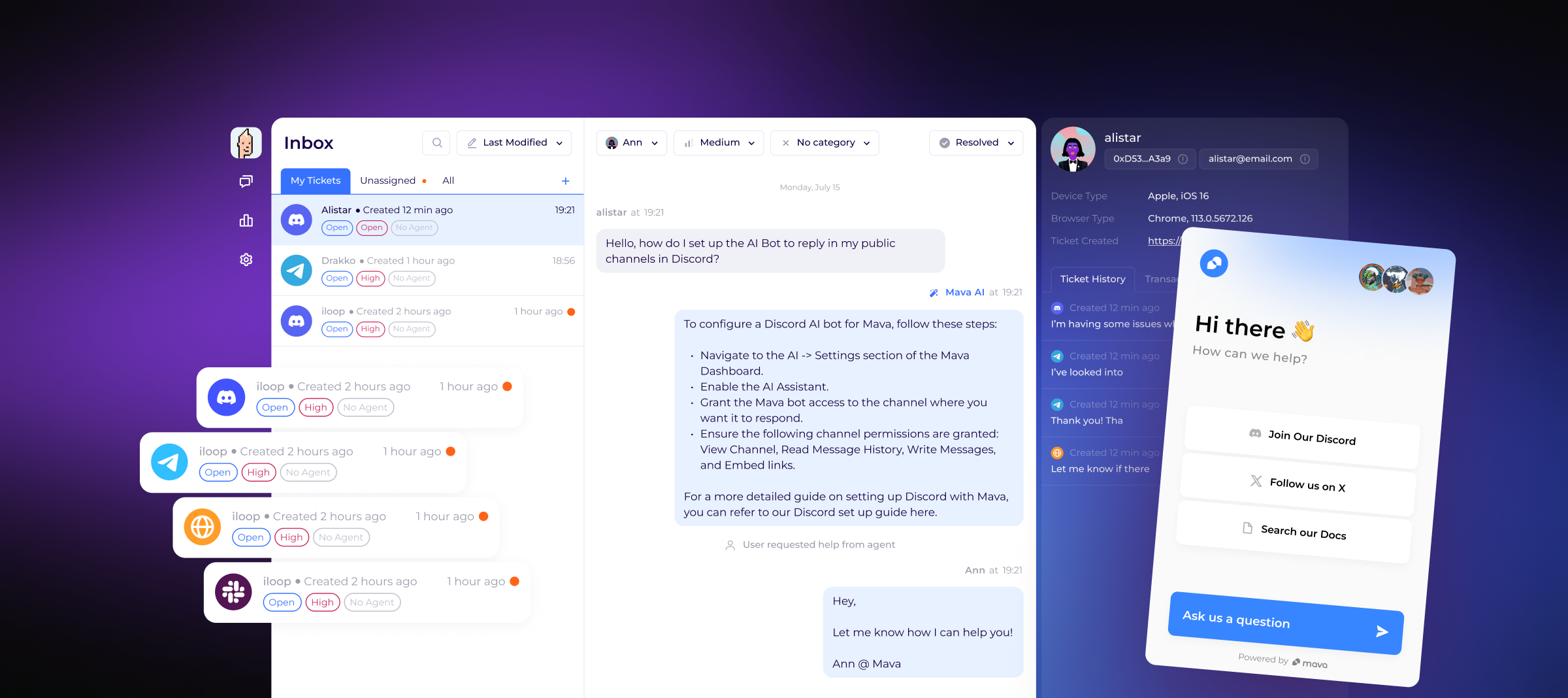 - 커뮤니티 채널 통합: Mava는 Telegram, Slack 및 Discord와 통합되어 다양한 채널에서 지원 티켓을 하나의 공유 수신함에서 관리할 수 있습니다.