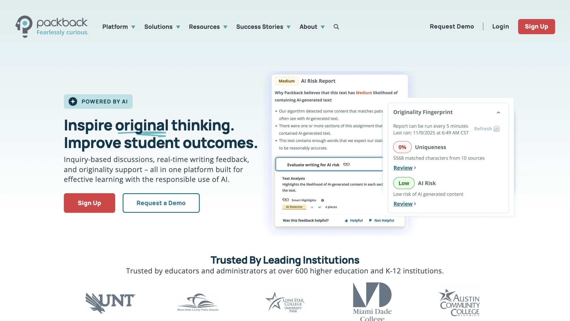 Packback은 학생의 글쓰기와 학습 결과를 개선하는 방식으로 교육에 AI의 힘을 가져옵니다. 단순한 도구가 아니라 학생들에게 힘을 주고 발전을 지원하는 플랫폼입니다.