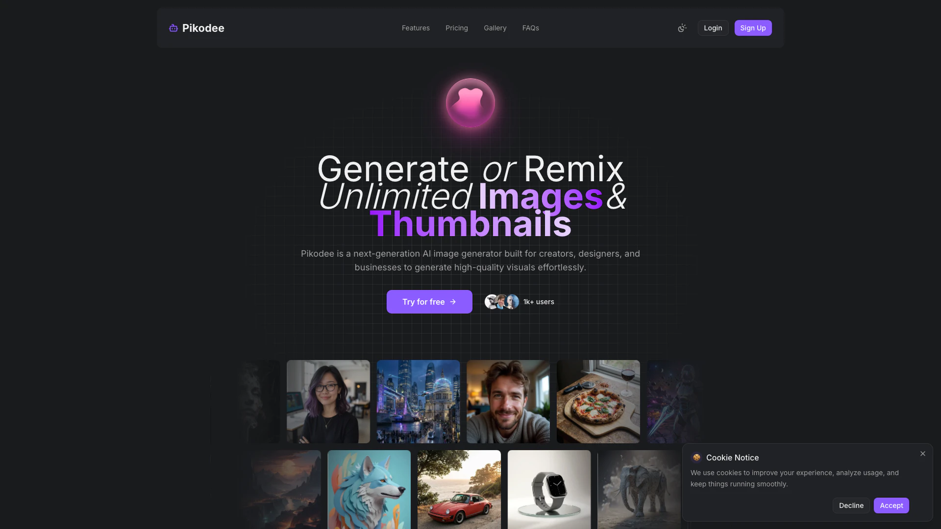 Pikodee는 창작자, 디자이너, 마케터 및 이미지를 효율적으로 생성하려는 기업 등 다양한 사용자층을 위해 맞춤 설계되었습니다. 디자인 기술이 필요 없이 소셜 미디어, 마케팅 캠페인 또는 디자인 프로젝트를 위한 빠른 시각적 콘텐츠가 필요한 사람들에게 특히 유용합니다. 콘텐츠 제작자, 소규모 비즈니스 소유자 또는 대규모 마케팅 팀의 일원이라면 Pikodee는 이미지 생성 프로세스를 간소화하는 도구를 제공합니다.