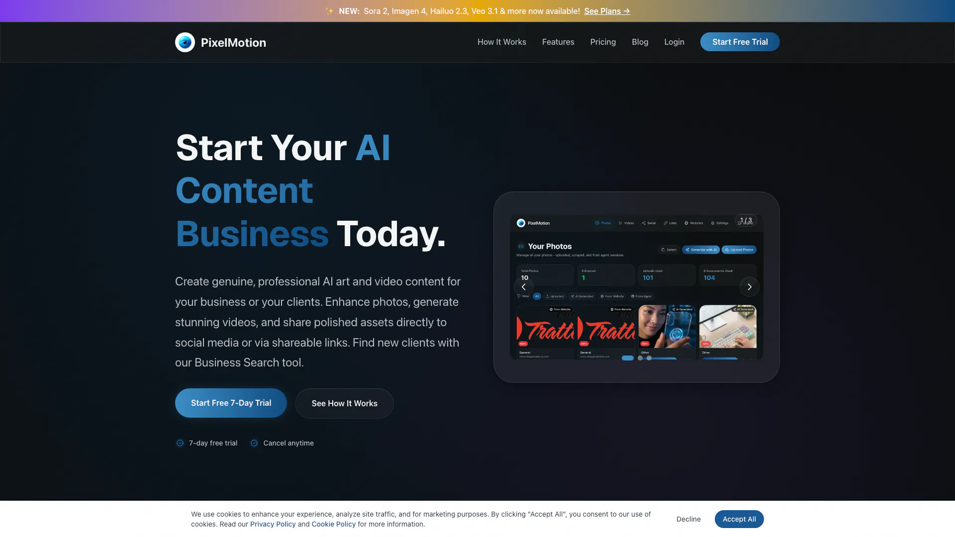 PixelMotion은 사진을 멋진 비디오로 변환하는 혁신적인 AI 도구로, 사용자가 이미지를 향상시키고 매력적인 비디오 콘텐츠를 손쉽게 생성할 수 있도록 합니다. Qwen Image 2512, Luma Ray2, Runway Gen-3 및 Flux와 같은 고급 AI 모델의 힘을 활용하여 PixelMotion은 콘텐츠 제작 프로세스를 간소화하여 개인 및 기업이 품질을 희생하지 않고 콘텐츠 생산을 확장할 수 있도록 합니다. 이 플랫폼은 특히 전문적인 비주얼 콘텐츠를 빠르고 효율적으로 생성하려는 마케터, 콘텐츠 제작자 및 소규모 비즈니스 소유자에게 적합합니다.