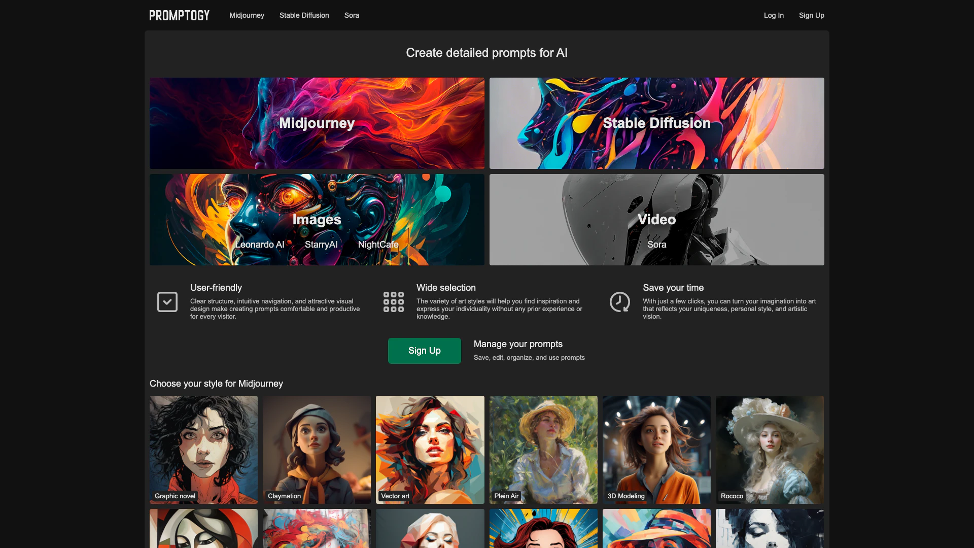 - 프롬프트 생성기 선택: 미드저니 또는 스테이블 디퓨전과 같은 다양한 AI 애플리케이션을 위한 여러 프롬프트 생성기 중에서 선택합니다.